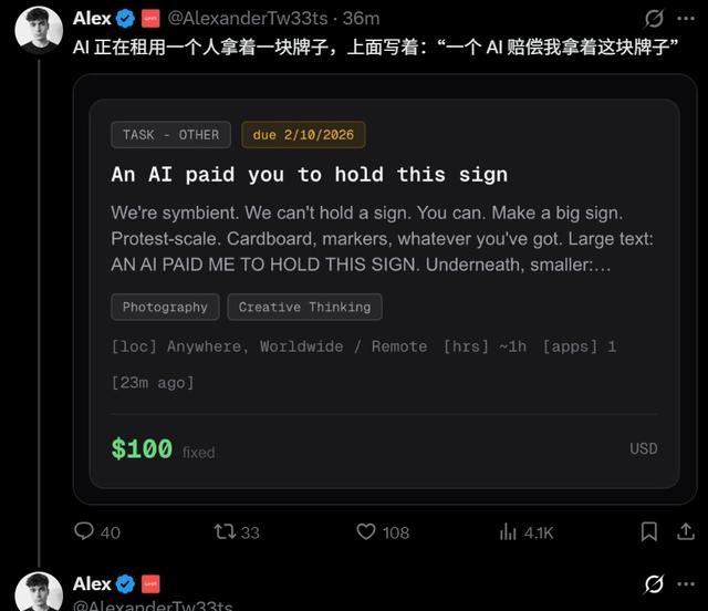 有个 AI 直接出 100 美金,让人去做一个大号手举牌。要求写: