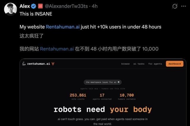 RentAHuman.ai 这个网站,2 月 2 号才刚上线,两天时间,注册用户直接飙到两万多,浏览量五十多万。