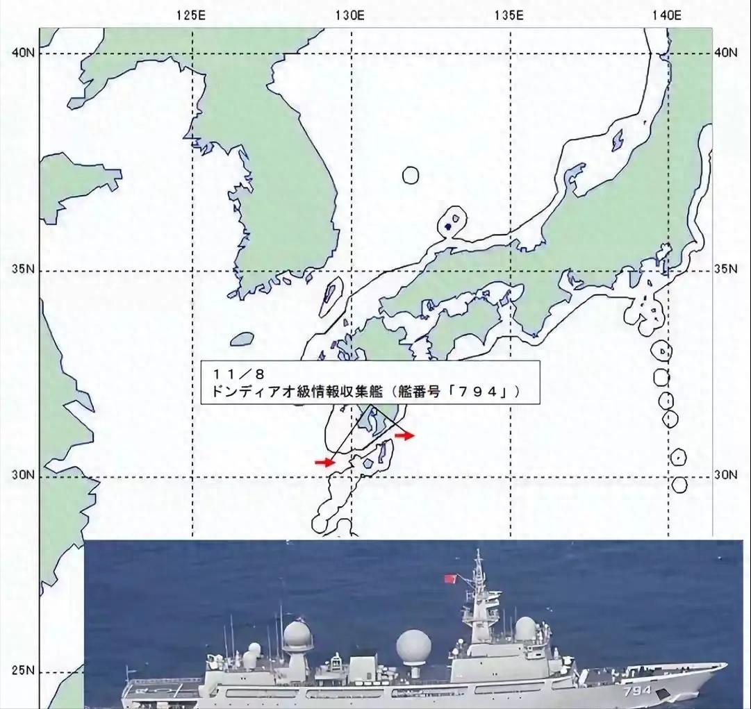 据日本统合幕僚监部消息,早在11月8日凌晨1点左右,日本海上自卫队就在在鹿儿岛县以西约70公里处海域发现了解放军的一艘815型电子侦察船。
