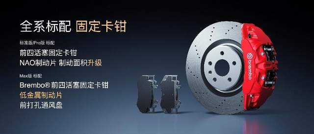 此外,制动系统也进一步升级,全系标配前四活塞固定卡钳。标准版与Pro版采用NAO摩擦片,摩擦片面积大幅增加,兼顾制动静音与舒适性;Max版采用低金属摩擦片,具备更高耐高温性能与抗磨损能力,半载状态下连续制动40次无热衰减。制动踏板反馈感接近SU7 Ultra,减速响应更快,支撑力更强,控制精度显著提升。同时,全系车型升级为265mm后宽胎,提升车辆操控稳定性与抓地性能。