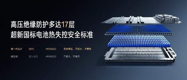 在热安全方面,新一代SU7电池包可以做到远超新国标的电池热失控安全标准:在55℃满电状态下,单电芯发生热失控时,系统可实现热失控不扩散、不起火、不爆炸。同时,全系标配行业最高ASIL-D安全等级电池系统,BMS电池管理系统可在突发情况下4ms内完成紧急断电,并通过24小时车云协同机制实现全天候安全预警。