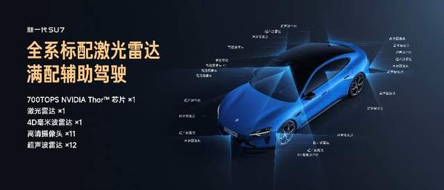 新一代SU7全系标配NVIDIA DRIVE AGX Thor™车载计算平台,算力高达700TOPS,较前代提升37.8%,采用与NVIDIA旗舰芯片同源的Blackwell架构,具备更强的并行计算与深度学习能力,支持更高速数据传输与多样化连接,配合高性能DDR缓存,显著提升系统响应速度与决策效率。在感知硬件方面,全系标配1个激光雷达、1个4D毫米波雷达、11个高清摄像头、12个超声波雷达。