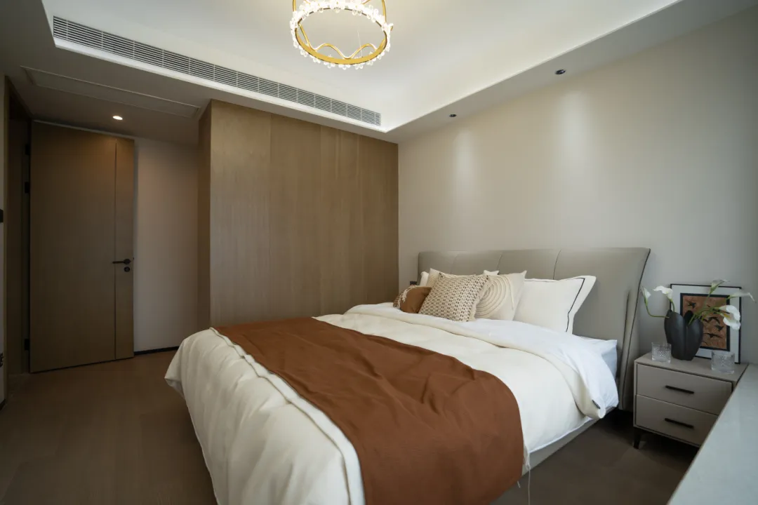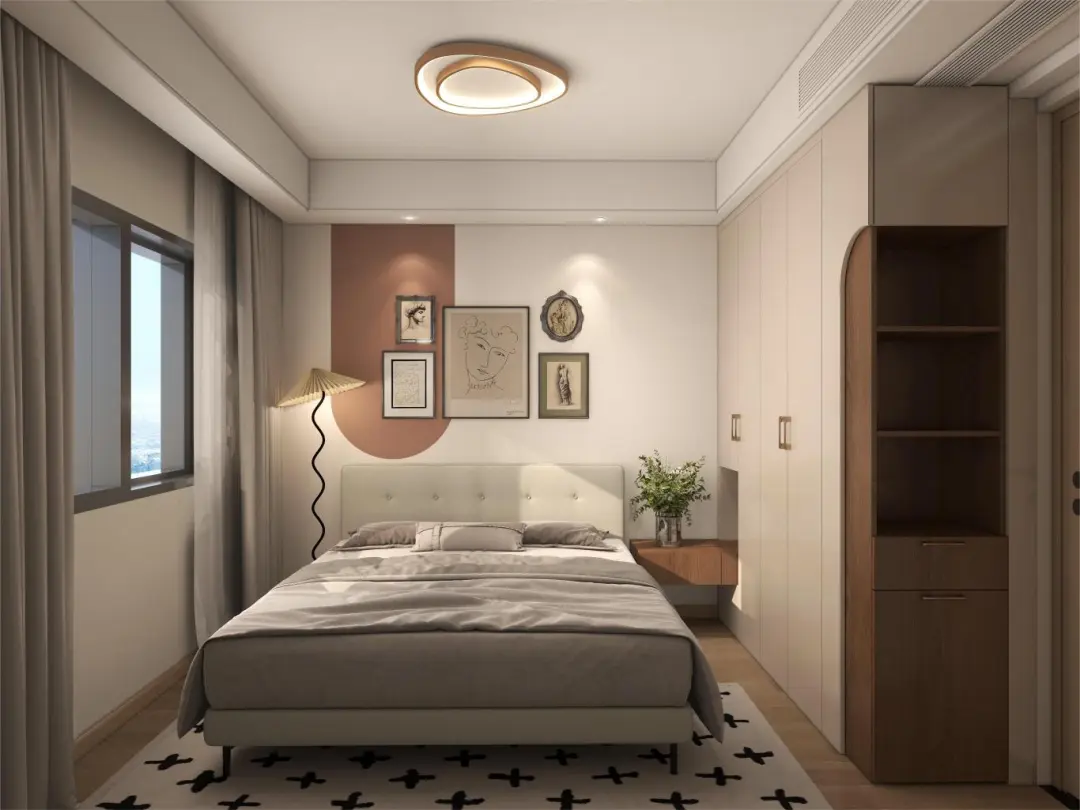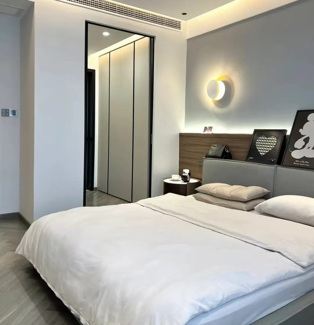 不少人装修时只装一个主灯,晚上一开灯,整个卧室亮得像手术室,根本没法放松。卧室是休息的地方,灯光得讲究层次感。可以试试主灯 + 壁灯 + 台灯的组合。主灯提供基础照明,壁灯营造氛围,台灯方便睡前阅读。灯光的色温也很重要,选 3000K 左右的暖光灯,光线柔和,不会刺激眼睛,轻松打造助眠环境。另外,还可以装个调光开关,根据不同场景调节灯光亮度,浪漫氛围说来就来。
