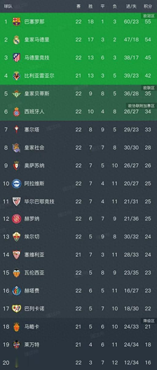 北京时间2月2日,西甲第22轮结束了9轮比赛,我们看看最新积分榜变动!