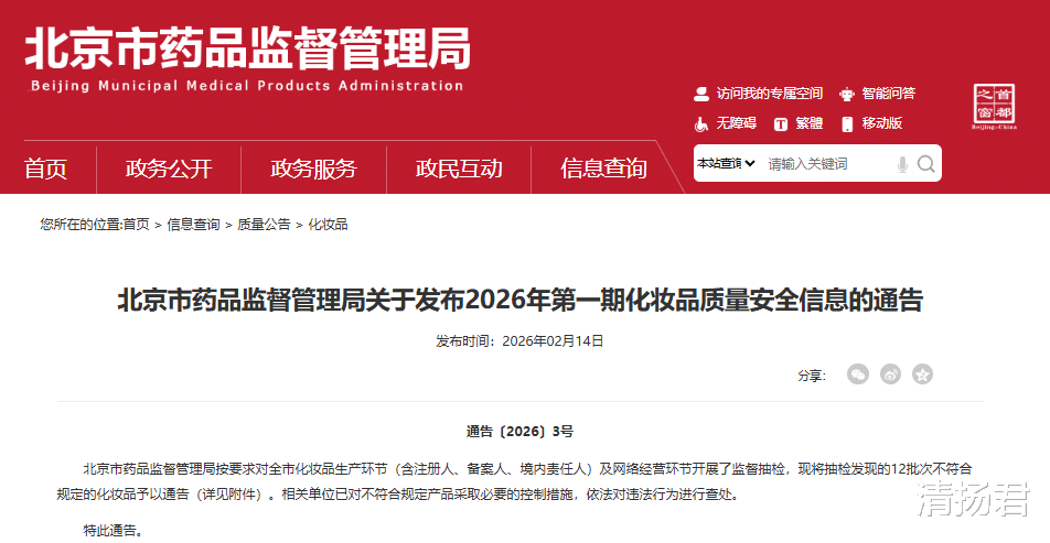 近日,北京市药品监督管理局公布了《2026年第一期化妆品质量安全信息的通告》,12批次产品被点名不合格。从知名品牌的防晒隔离乳,到宣称“天然植物”的护发素,再到日常用的眉笔、儿童牙膏,问题五花八门:菌落总数超标、禁用原料赫然在列、防晒剂成分“偷梁换柱”,甚至还有眉笔检出重金属砷。更耐人寻味的是,多家企业第一时间跳出来喊冤:“这批次不是我们生产的!”