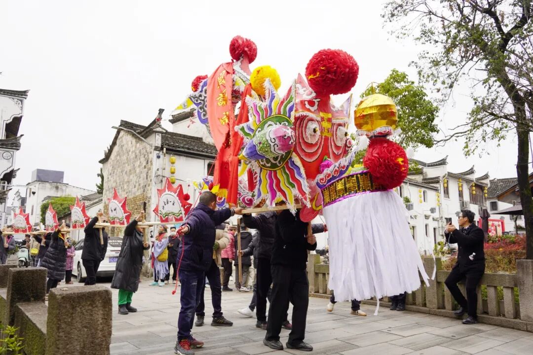 耳畔传来激昂的鼓点,那是浦江板凳龙的非遗年味在舞动。作为人类非遗的瑰宝,这条缀满彩绘的“巨龙”身披红绸,龙身绘就寿桃、祥云等吉祥纹样,每一节板凳都承载着书画之乡的匠心。表演场上,舞龙者身着红黄劲装,腾挪翻转间,“一字长龙”“元宝圈”“盘龙归心”等阵式轮番上演,龙首含笑俯首,龙尾甩动生风,将“孝义传家”的家风故事融入灵动舞姿。巡游途中,巨龙蜿蜒穿过义门桥、郑氏宗祠,红灯笼的光影与龙身的彩绘交相辉映,鼓声、欢呼声与游客的惊叹声交织,让千年古镇的每个角落都洋溢着热闹喜庆的年味儿 。