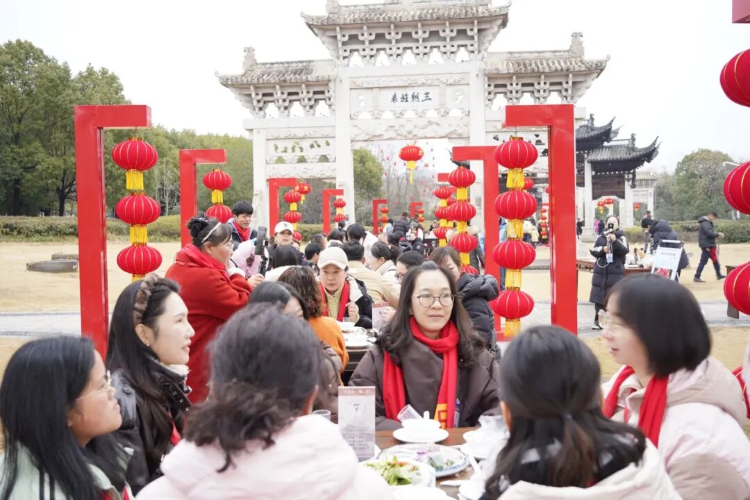 最动人的年味,藏在儒乡家宴的烟火气里。牌坊群下,25张餐桌沿青石板路铺开,青蓝色桌布搭配竹制餐具,每桌摆放的活动手册里,藏着“一根面”象征“家和绵长”、“馒头煨肉”寓意“富足团圆”的美食密码。席间,红灯笼映照着团圆笑脸,马年主题伴手礼传递着满满福气,地道的浦江风味与家风故事交织,让每个味蕾都记住新年的温暖滋味 。