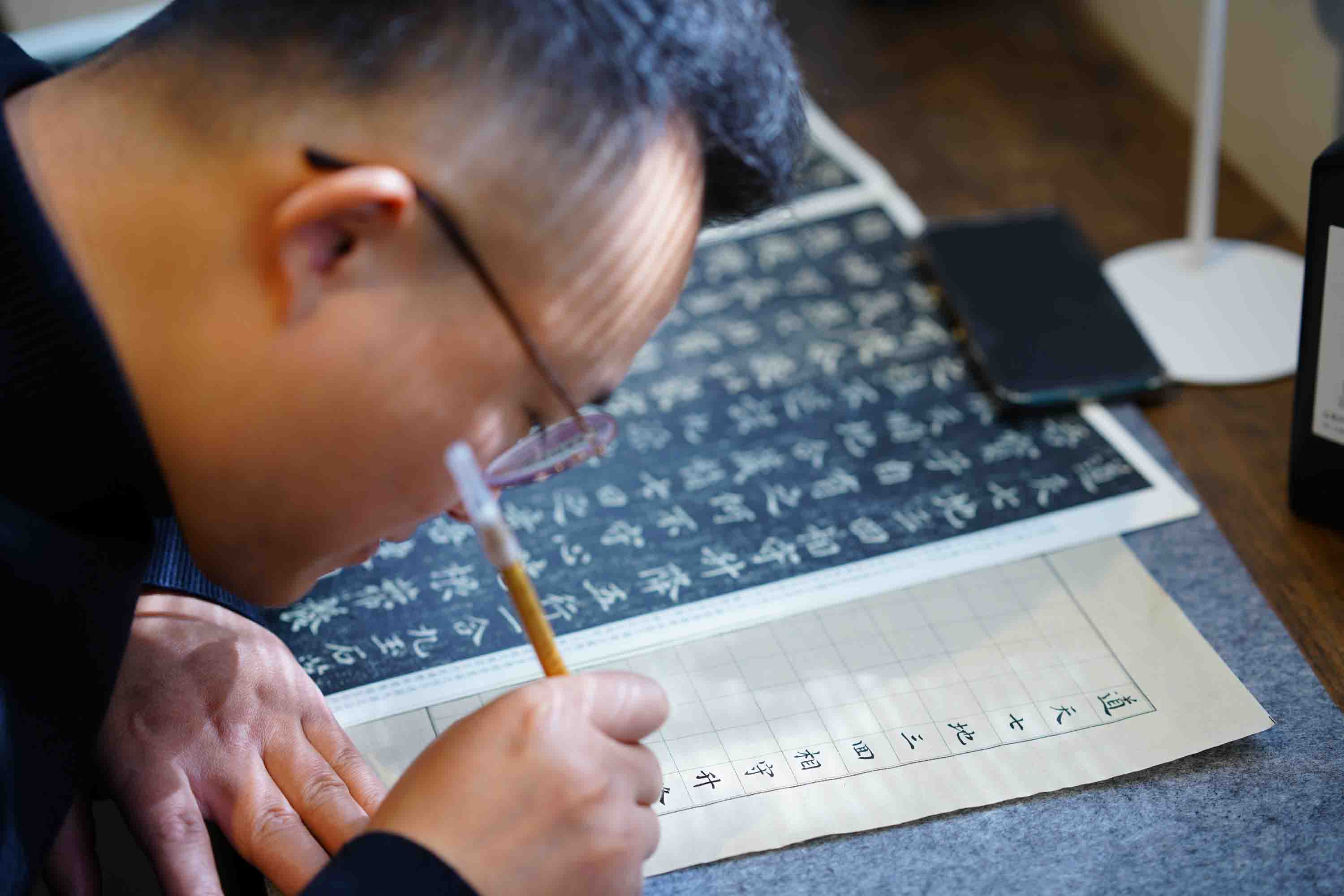 理论阐发毕,便入挥毫实践时。互动环节将现场氛围推向高潮,黄瀚老师亲身示范,中锋行笔的劲挺、侧锋取势的灵动,起笔的藏露方圆、转折的刚柔相济、收笔的回锋出锋,皆讲解得细致入微,演示得行云流水。他俯身指导爱好者执笔调锋,纠正运笔偏差,点拨大家体悟“力透纸背”的质感、“气韵生动”的妙境。不少初次执毛笔的爱好者,在老师的悉心指引下凝神落笔,于宣纸上勾勒出初具意趣的点画,真切触摸到汉字书法的线条之魂。书友们围案交流,墨香袅袅,与场馆内石雕造像的沉静气韵相融,满室尽是沉醉于笔墨与石刻世界的悠然雅韵。