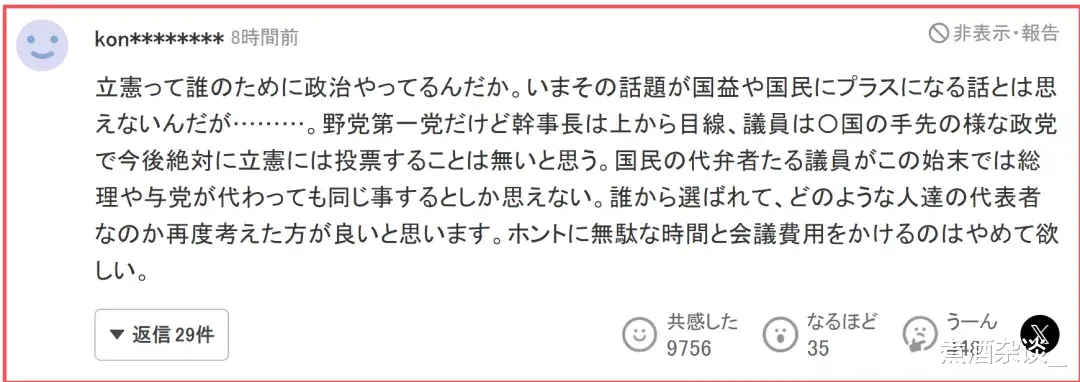 9756高赞的留言说:立宪是为谁搞政治的?我不认为现在这个话题对国家利益和国民有什么帮助……虽然(立宪民主党)是第一大在野党,但干事长是居高临下的态度,议员是像中国走狗一样的政党,我认为今后绝对不会进行立宪投票。