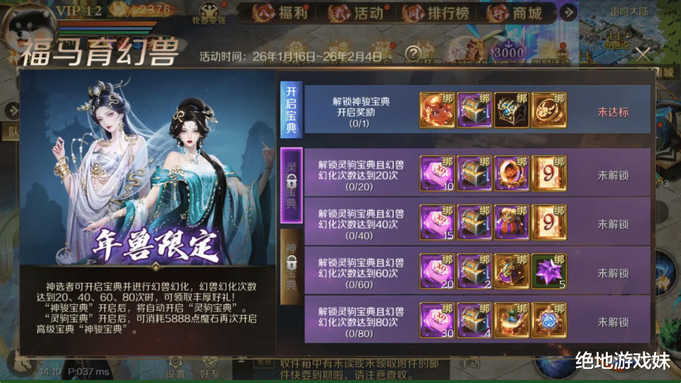 零氪玩家聚焦免费获取与无门槛福利,主打“低成本薅满基础奖励”。获取端优先肝乱世佳缘活动,1月15日至3月13日期间,70级以上玩家通关12个关卡、集齐三大信物,就能免费领取15星赤焰灵驹·蹦蹦,每日签到箱开头像的概率递增,坚持打卡可保底拿限定外观。福利端必参与年兽免费试用,领取满级满觉醒的吕布、貂蝉在混沌神域无限挑战,测试战力适配性;同时蹭幻化福利季精力减半,免费幻化现有幻兽积累福骏积分,冲击3万积分的京东卡抽奖,吉从天降红包也能蹲守,积少成多不浪费资源。