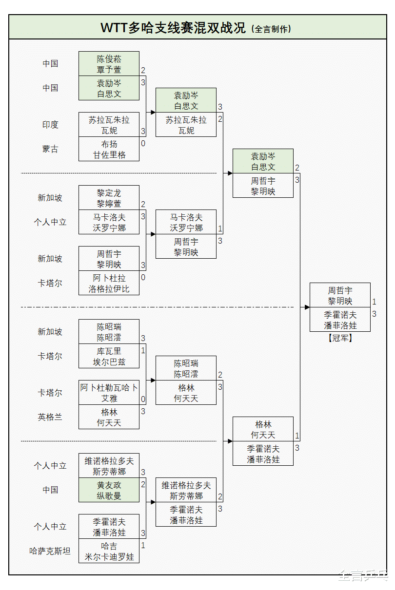 最终混双的决赛没有国乒选手参与,结果俄罗斯的季霍诺夫/潘菲洛娃3-1胜周哲宇/黎明映斩获冠军。