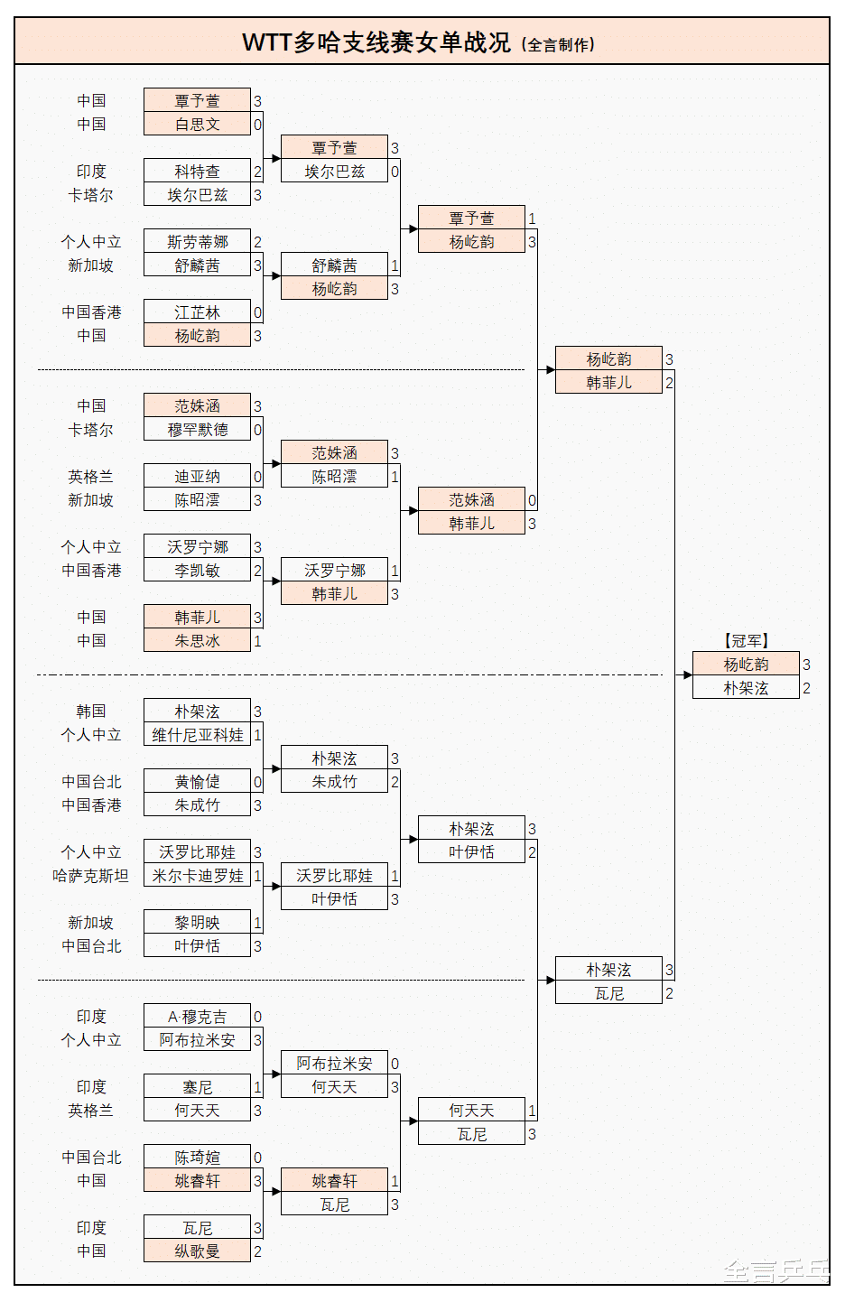 国乒女单这次有八位选手出战,结果多达五人输内战,包括白思文0-3覃予萱、朱思冰1-3韩菲儿、范姝涵0-3韩菲儿、覃予萱1-3杨屹韵、韩菲儿2-3杨屹韵。