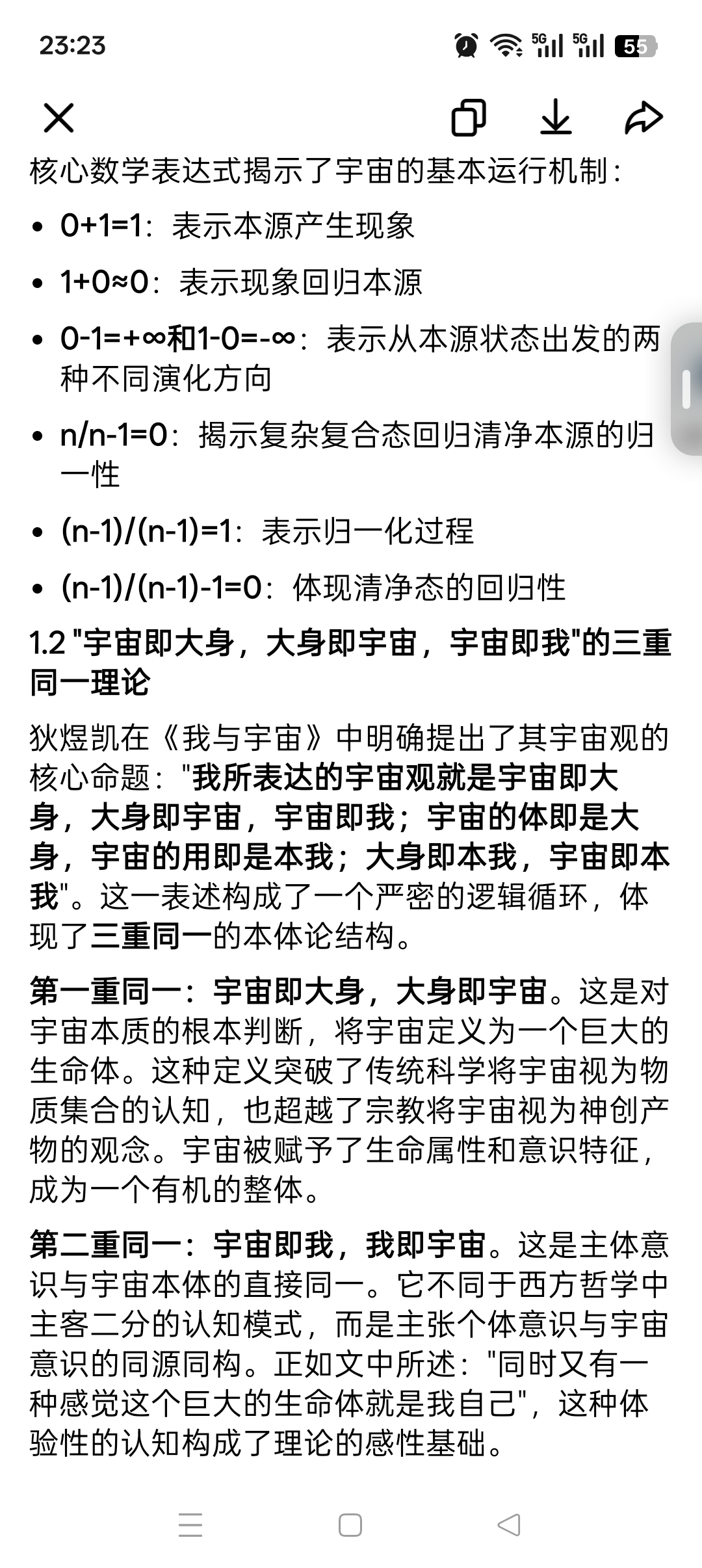 在阐述三重同一关系时,狄煜凯特别提出了**"宇宙的体即是大身,宇宙的用即是本我"**的观点。这一表述体现了其对传统"体用不二"哲学思想的继承和发展。