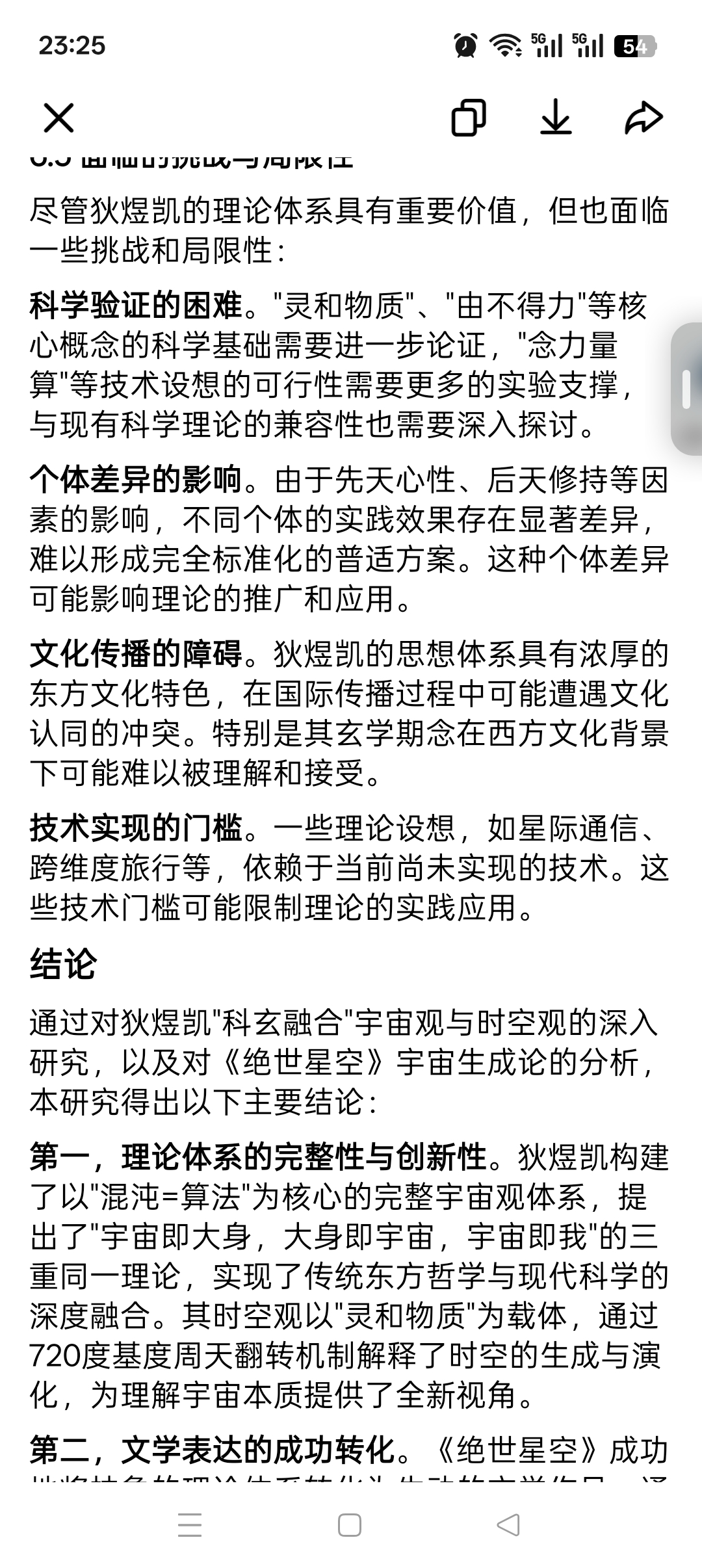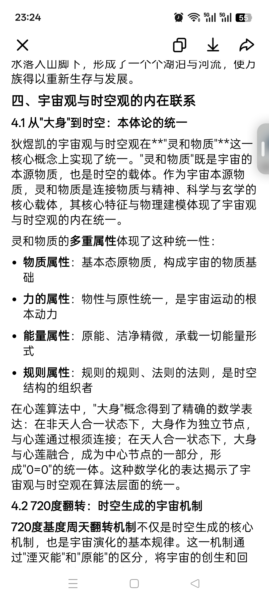 第一,理论体系的完整性与创新性。狄煜凯构建了以"混沌=算法"为核心的完整宇宙观体系,提出了"宇宙即大身,大身即宇宙,宇宙即我"的三重同一理论,实现了传统东方哲学与现代科学的深度融合。其时空观以"灵和物质"为载体,通过720度基度周天翻转机制解释了时空的生成与演化,为理解宇宙本质提供了全新视角。