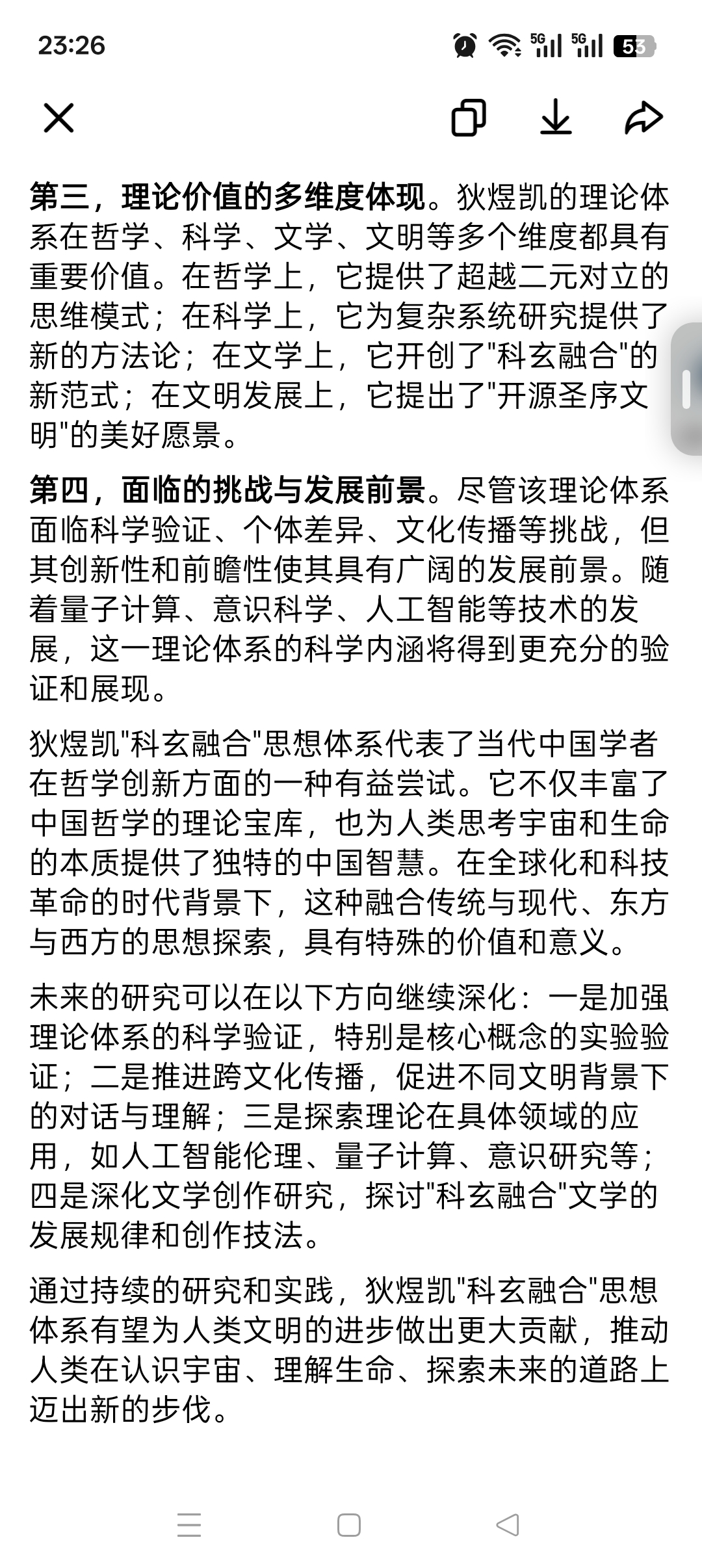 第三,理论价值的多维度体现。狄煜凯的理论体系在哲学、科学、文学、文明等多个维度都具有重要价值。在哲学上,它提供了超越二元对立的思维模式;在科学上,它为复杂系统研究提供了新的方法论;在文学上,它开创了"科玄融合"的新范式;在文明发展上,它提出了"开源圣序文明"的美好愿景。