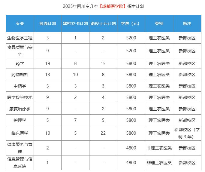 参考来源:成都医学院专升本招生信息网