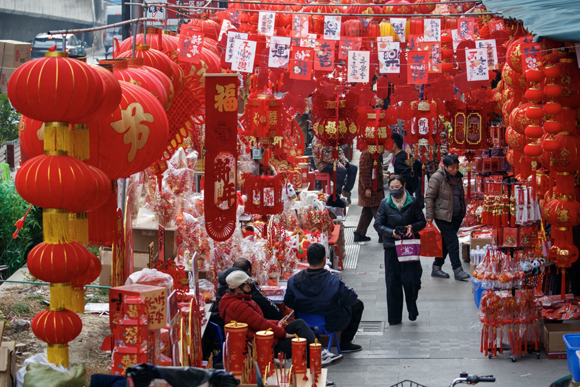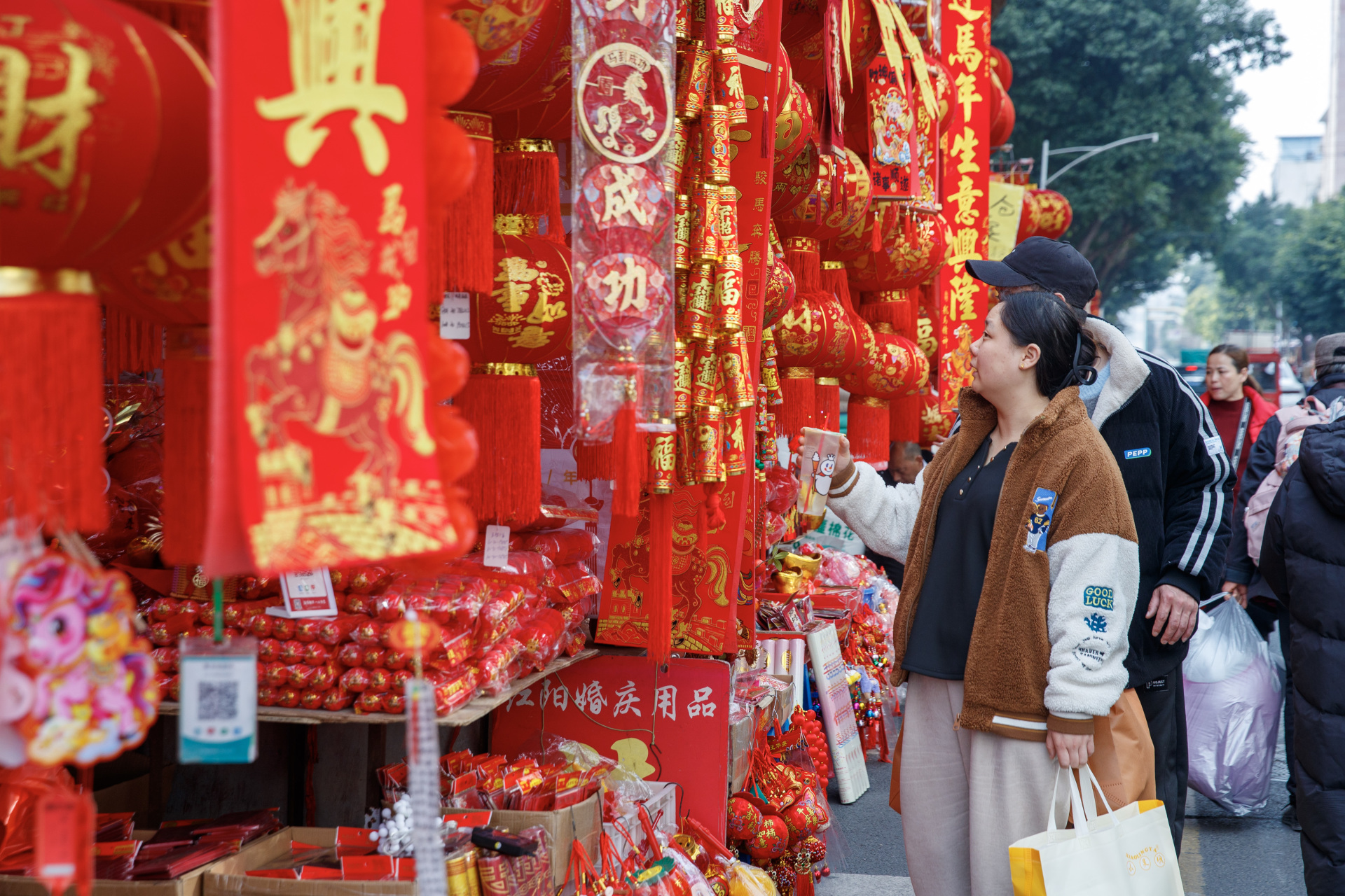 1月16日,在荷花池市场区域的北站东一路、东二路,肖家村四巷等道路两侧,众多销售春联福字、彩灯挂饰等年节用品的商铺把市场装点得红红火火,热烈的大红色,暖心的吉祥话,映满了人们的眼帘。
