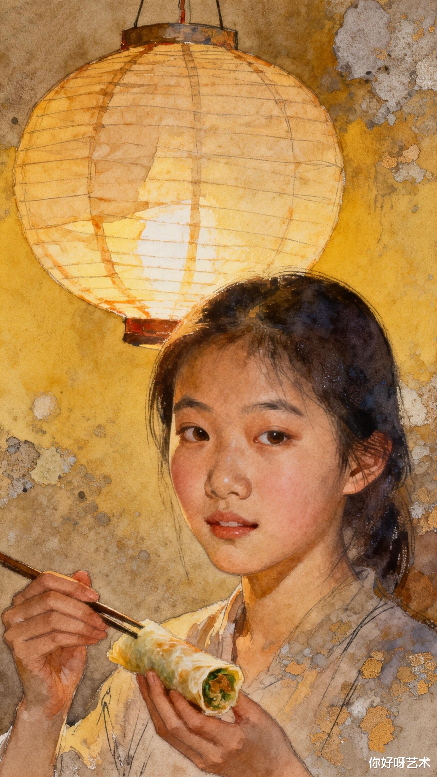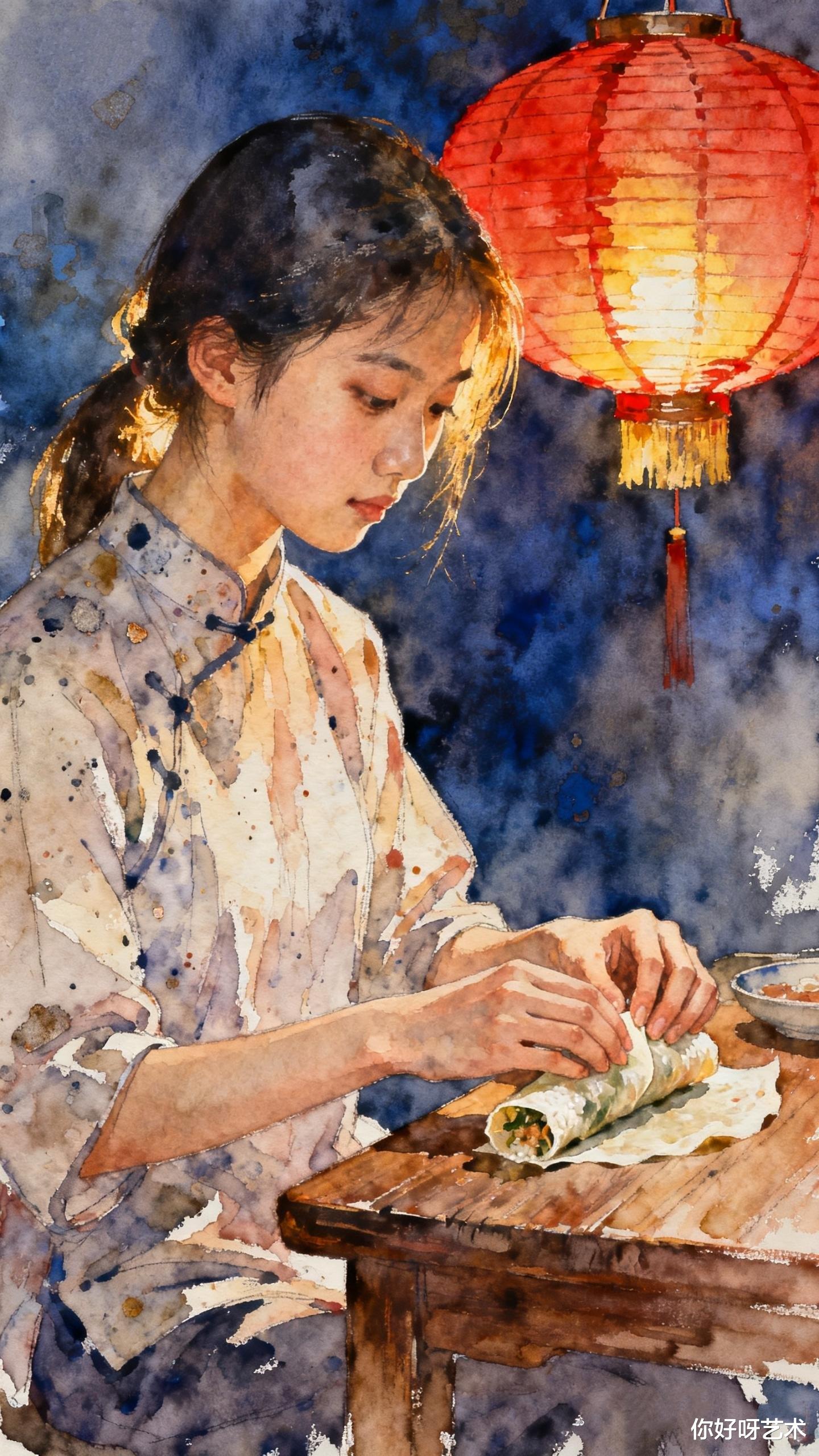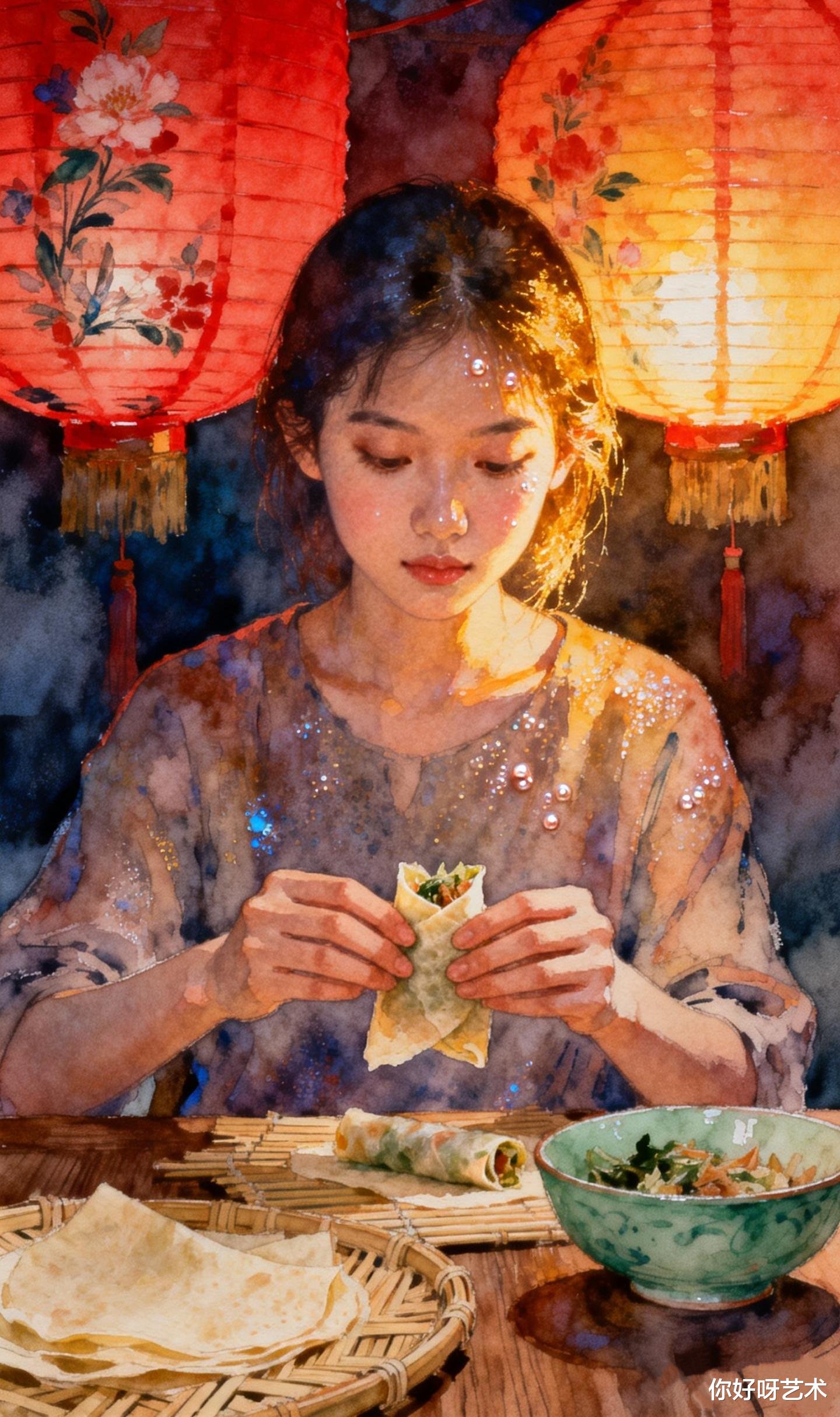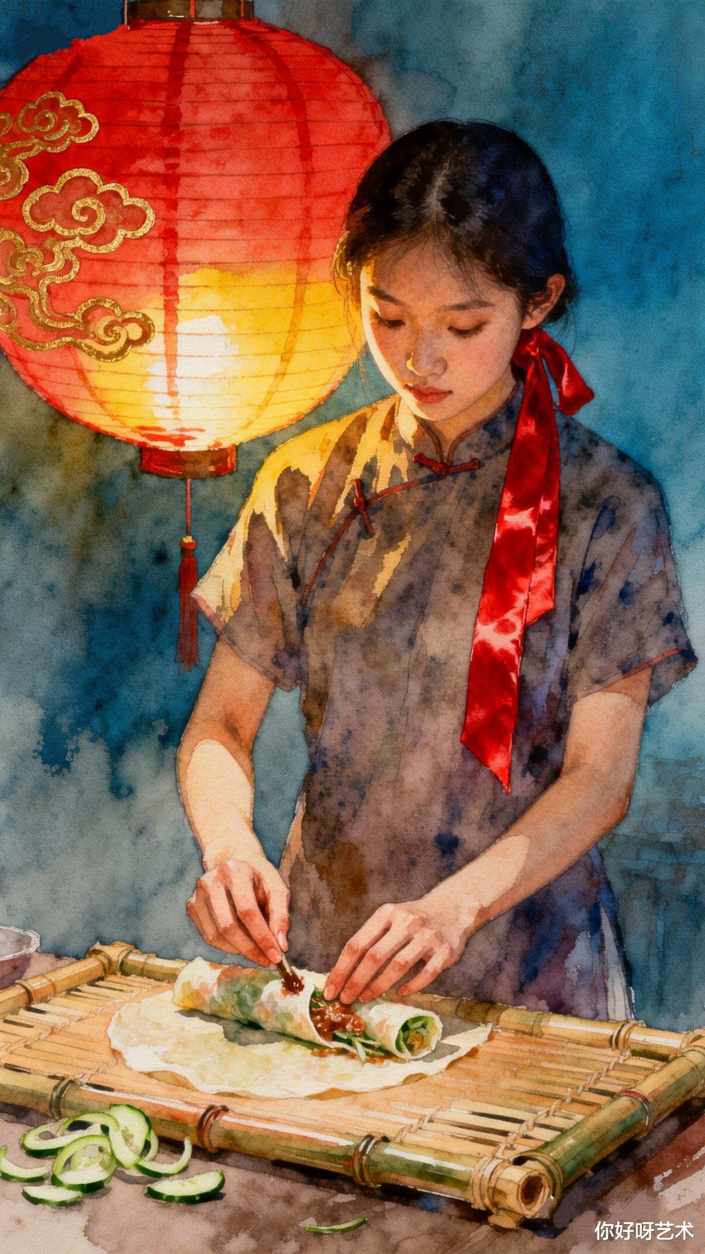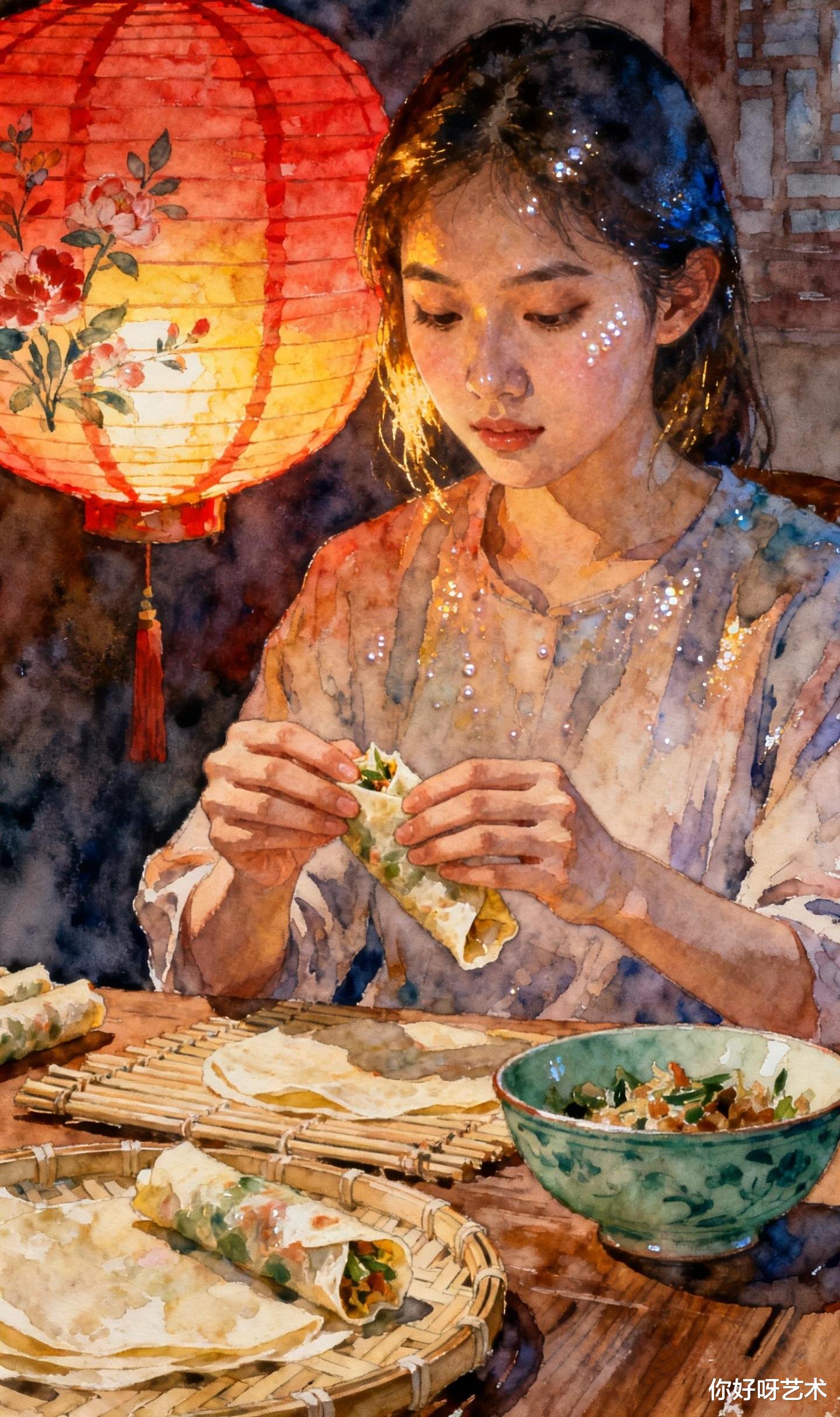 腊月十三的夜晚,水彩与春卷完成了奇妙的对话。少女知道,明天太阳升起时,颜料会干涸,春卷会吃完,但那些被艺术点亮的瞬间,会像春卷里的馅料,悄悄转化为生命的能量。在这个被手机屏幕切割的时代,她固执地相信:有些美好,必须用最原始的方式——画笔、灶火、还有一颗愿意慢下来的心——才能完整地捕获。