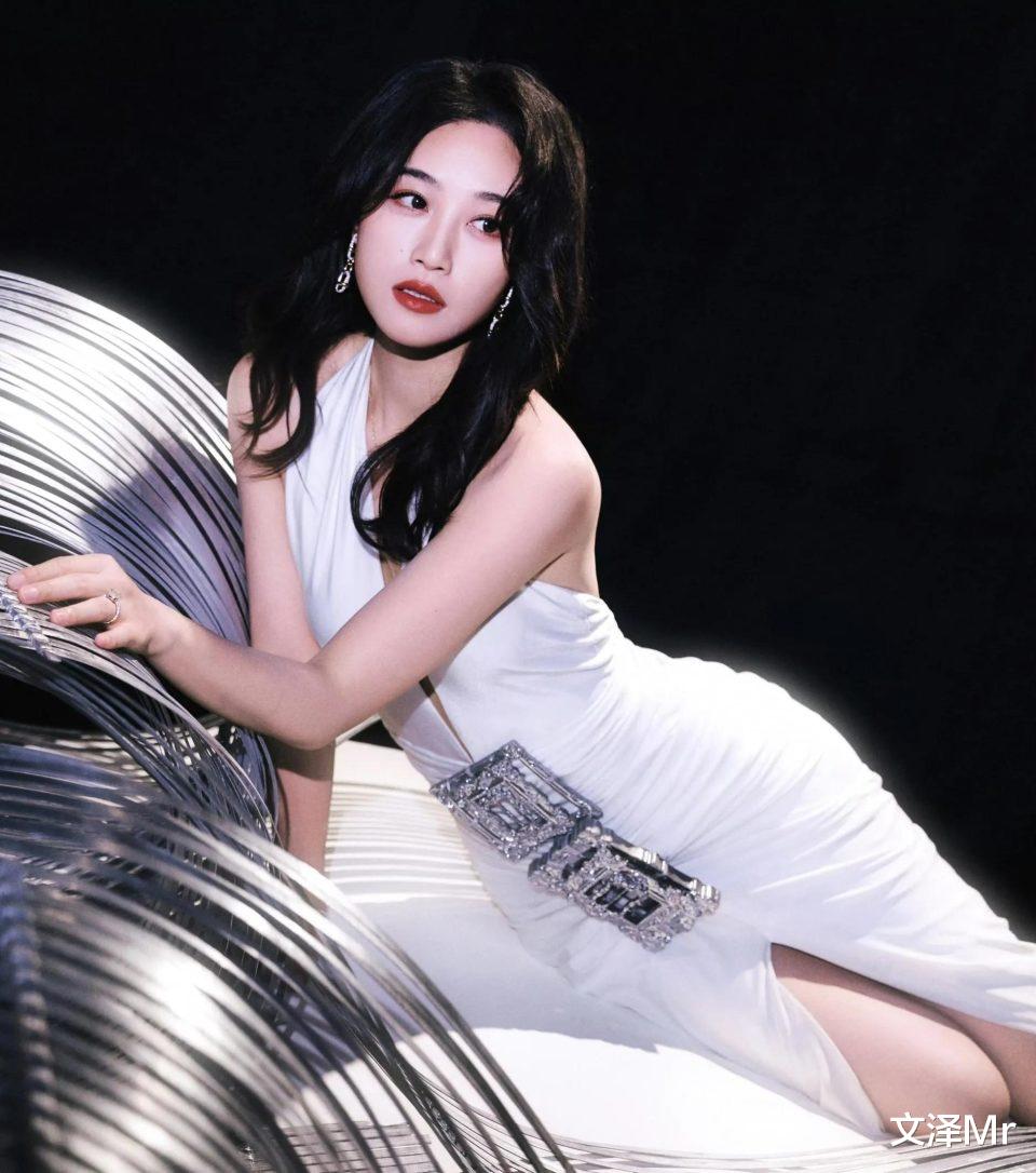 抽象黑色背景与灵动的金属丝构成超现实空间。蓝盈莹在飘带环绕间优雅交叠双腿,腰间闪烁的装饰与脚踝的纤细曲线呼应。这让人想起她在《北辙南辕》中饰演的鲍雪:既有都市女性的干练,又不失艺术生的灵动。正如她曾说:“白色是我的战袍色,简单却充满力量。”