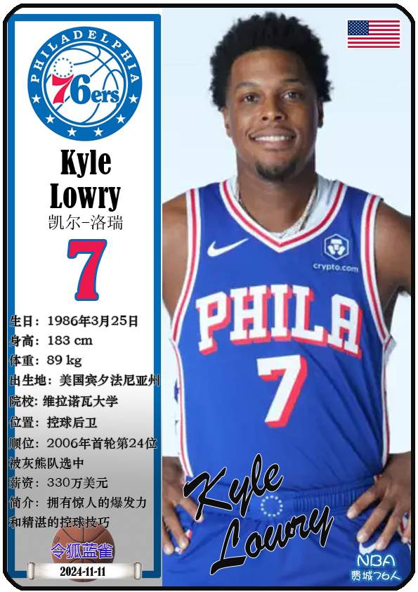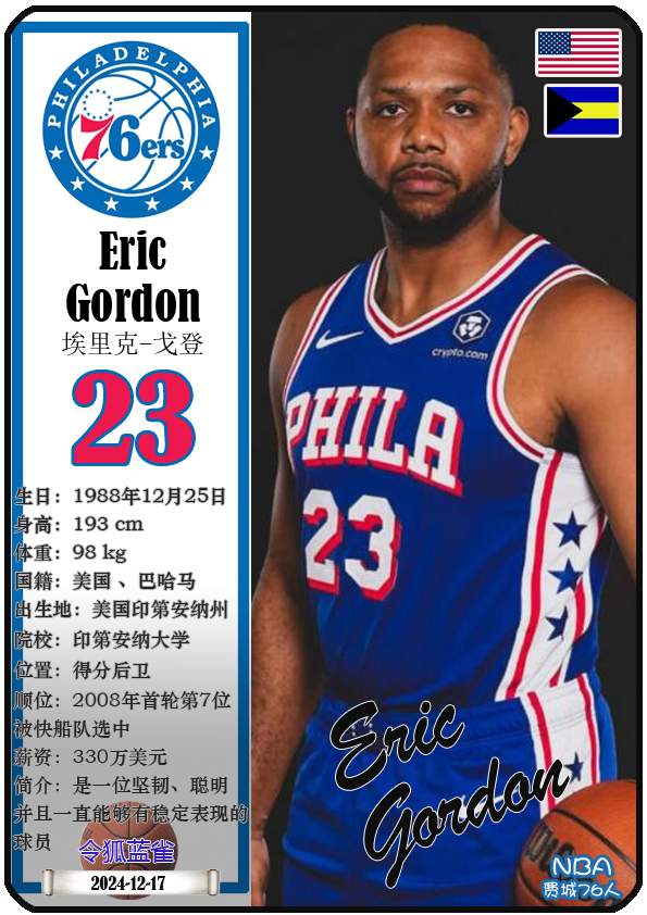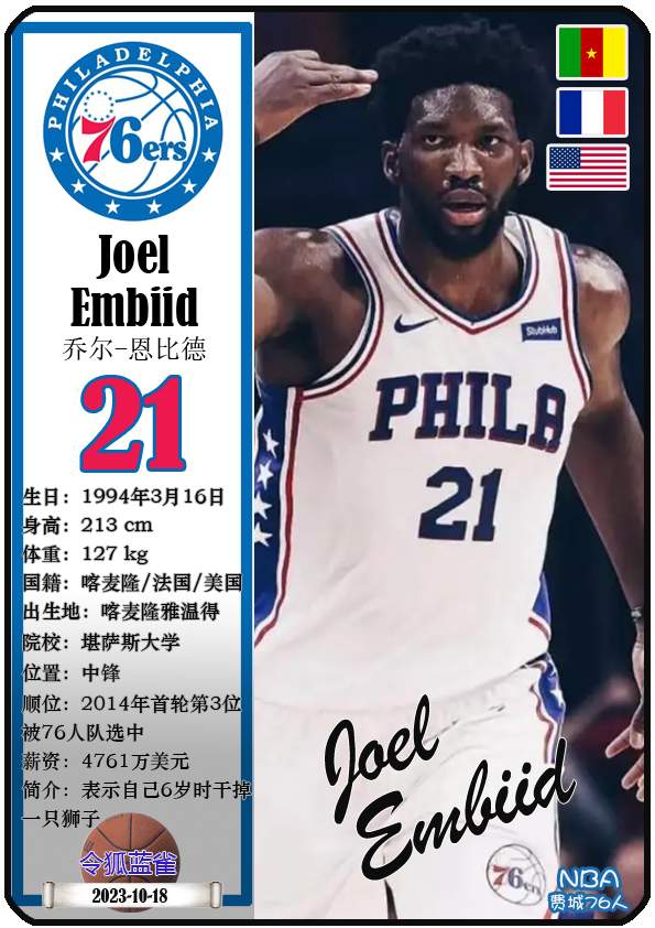 NBA费城76人队前身锡拉丘兹民族队成立于1937年,距今已有88年历史。截至2025年10月24日,球队主教练是尼克-纳斯,队内拥有球员乔尔-恩比德、保罗-乔治、泰瑞斯-马克西等。本期以球星卡的形式展示目前NBA费城76人的17名球员(按球衣号码排序):
