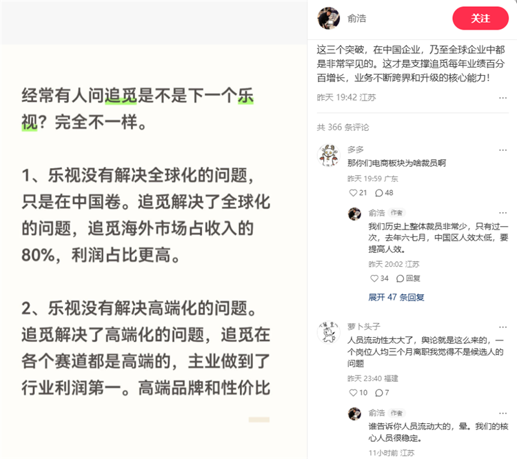 此外俞浩还回复网友,表示追觅此前电商板块裁员只有一次,因为中国区人效太低,另外追觅核心人员很稳定,并不是外界所传的人均三个月就离职。