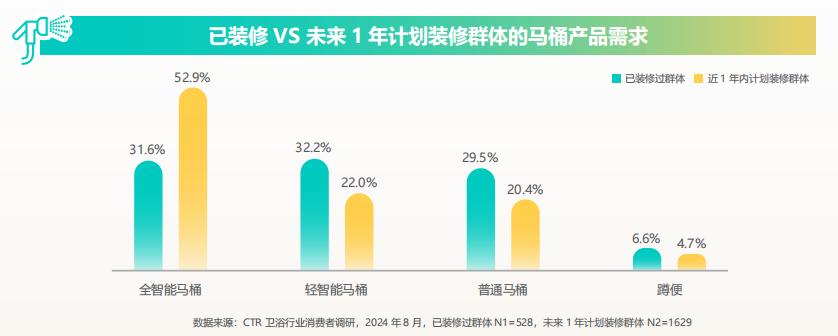 巨量引擎发布的《2024卫浴行业白皮书》调查显示,已经装修过的用户群体选择全智能马桶和轻智能马桶的比例分别占到了三分之一,而那些一年内计划装修的人里,则有超过一半打算选购全智能马桶。