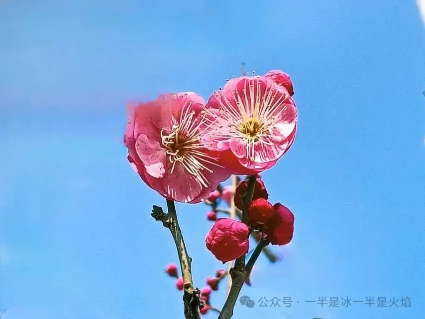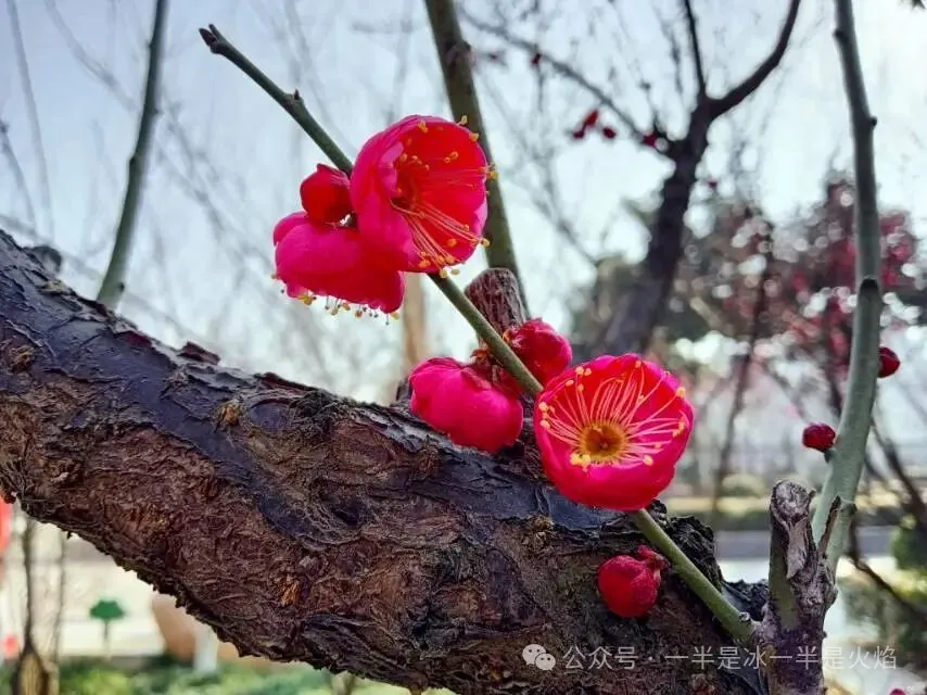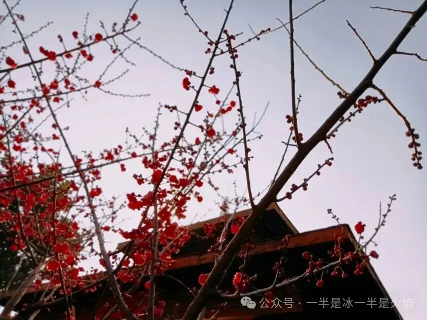 昨日说去寻梅,几日未见的红梅花,已盈盈满树。蜡梅枝头却几无花朵,只剩几缕幽香似隐若现。白梅依旧犹抱琵琶半遮面地兀自抱守着满枝花苞。