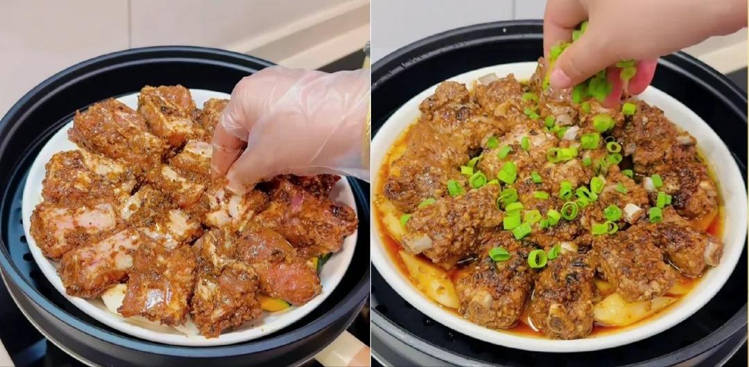 3、把调好的酱料倒进放着盐池滩羊排的盆里,再加入一勺红薯粉。为啥要加红薯粉呢?这红薯粉能让酱料更好地裹在羊排上,蒸出来的羊排口感也会更嫩滑。然后就开始抓拌吧,戴上手套,用手把羊排和酱料抓匀,让每一块羊排都裹满酱料,就像给羊排穿上了一件美味的 “外衣”。
