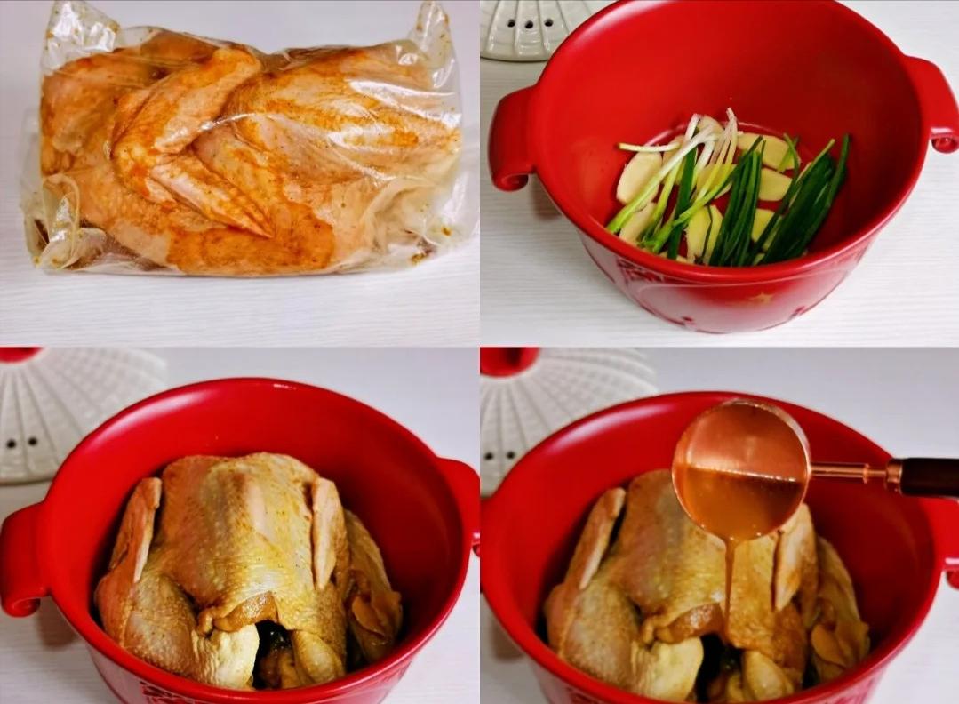 3、时间到了在锅里刷上一层油,把姜片和葱段摆进去,把腌制好的鸡放进锅里,把腌制的料汁也一起倒进去。盖上盖子开大火把水烧开,等水开了之后就转小火,慢慢炖 35 分钟。
