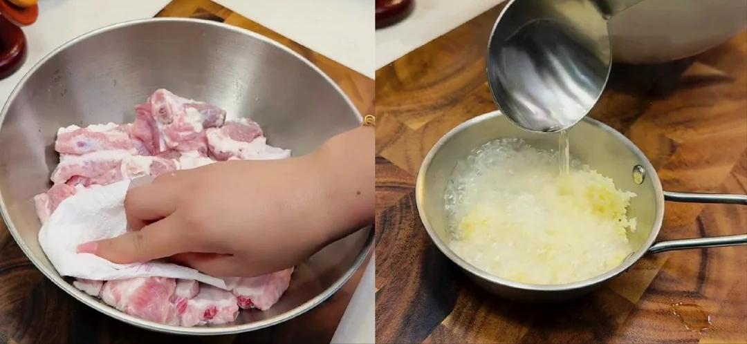 2、接下来调个酱料。先切点蒜末,切得碎碎的,这样香味才能更足。把蒜末放在一个小碗里,然后烧点热油。这热油一泼下去,蒜末的香味 “嗖” 地一下就出来啦,那叫一个香啊,感觉整个厨房都弥漫着蒜香。接着,往碗里加入一勺生抽,生抽能给羊排提鲜;再加入一勺蚝油,蚝油能让酱料味道更浓郁。最后,抓上两手豆豉酱放进去,用筷子把它们搅拌均匀。