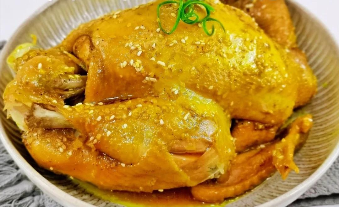 4、35 分钟到了,撒上熟芝麻,再焖个 15 分钟。时间一到,就可以把鸡从锅里取出来啦,装到盘子里,再点缀上一些葱丝,一道简单又美味的手撕盐焗鸡就大功告成啦!