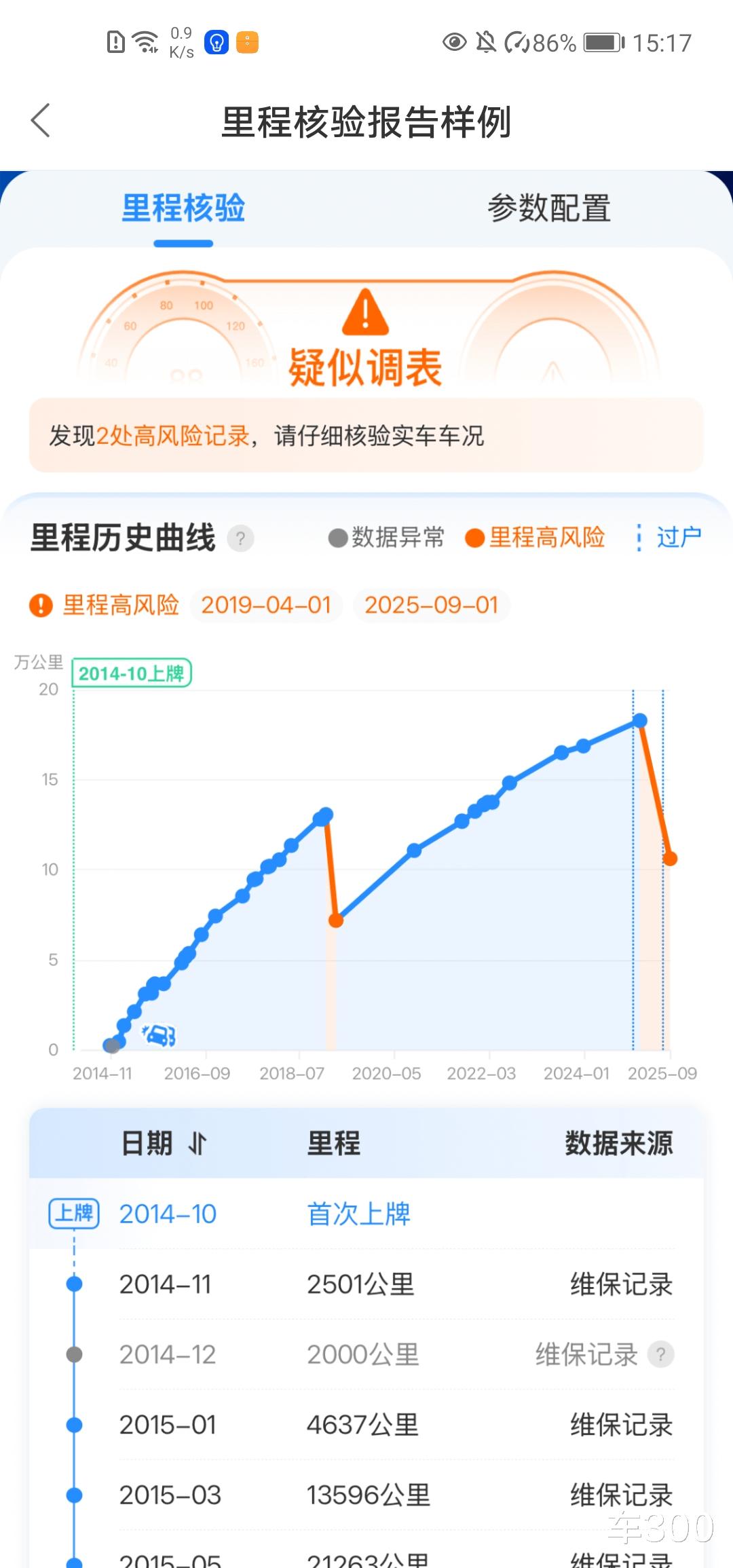 车300二手车软件上有个“查调表车”功能,综合了维修保养、出险理赔、OBD实时数据和车300线下检测数据,可以快速查询二手车真实公里数。只要输入车架号,就可以轻松获取查询报告。如:2014年11月维保记录显示里程为2501公里,2014年12月维保记录为2000公里,就意味着,该车数据异常,极大概率存在里程风险,疑似调表。