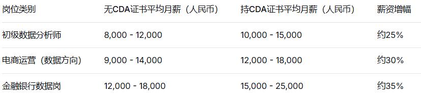 更直观的是,CDA持证人能获得显著的薪资优势。根据CDA数据分析师研究院联合多家招聘平台发布的《数据人才薪资报告》显示,在相同工作年限和经验背景下,持有CDA认证的数据相关岗位从业者,其平均薪资比无证书者高出20%-35%。