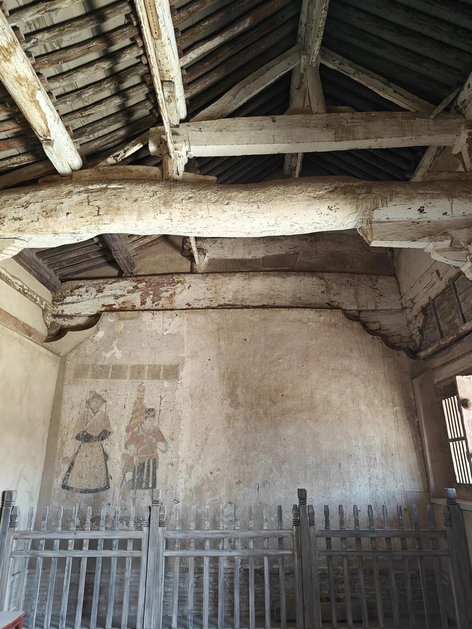 如果说大殿的建筑结构是凝固的音乐,那么殿内东墙壁上的元代壁画,就是一幅鲜活的历史画卷。前些年,在对殿宇进行修缮时,施工人员小心翼翼地揭开了覆盖在壁画上的层层遮盖物,让这幅沉睡多年的作品重见天日。可惜的是,由于岁月侵蚀和过往保护不善,壁画面积不大,画面上仅存两个模糊的人物形象。但正是这仅有的画面,却有着丰富的解读空间。