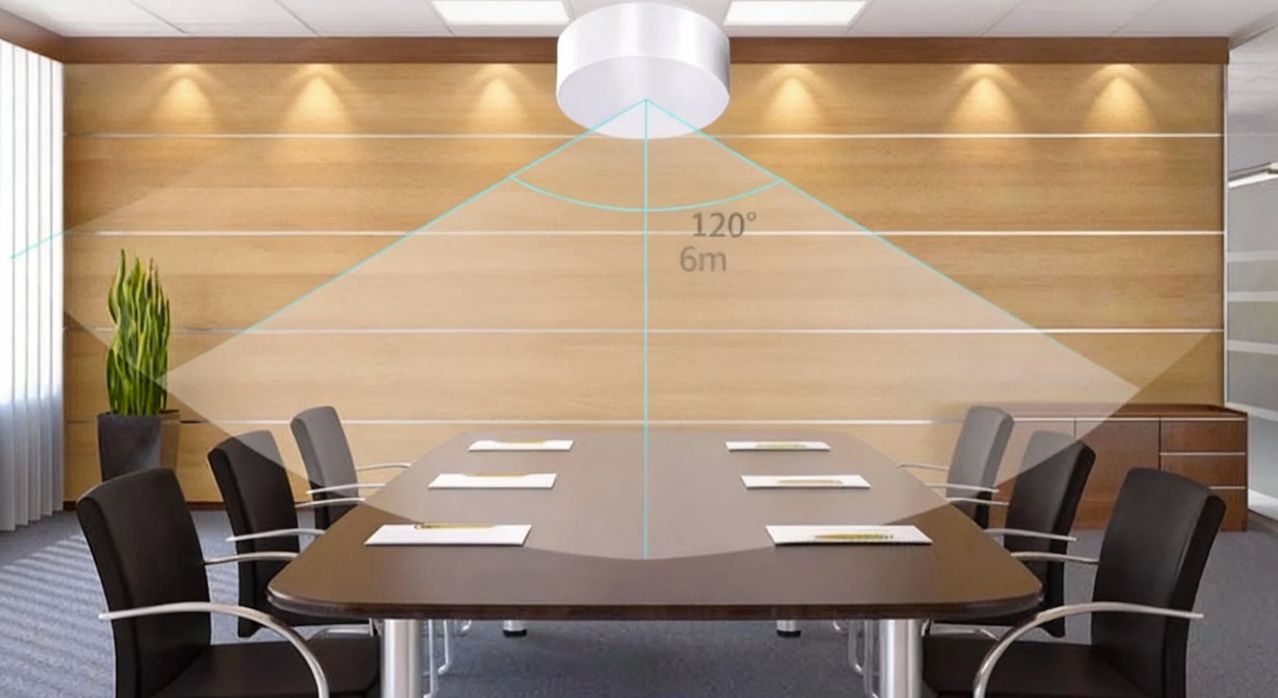 1. 识别精准无死角红外感应需要人体移动才能触发,当参会者静坐开会时,很容易被误判为"无人"而导致自动关灯、释放房间。60G毫米波雷达采用FMCW(调频连续波)技术,即使人员静止不动,只要存在呼吸微动就能持续感知。120度广角、8米探测半径,轻松覆盖40平米标准会议室,角落里的人也不会漏检。
