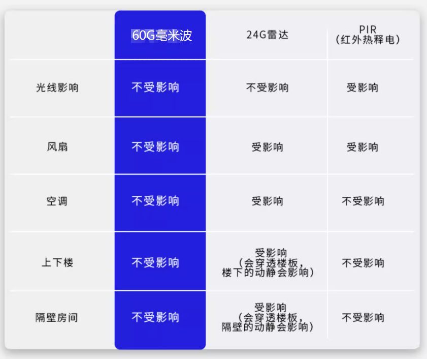 准确性强:抗干扰能力强不同于红外受温度、光线影响大,24G雷达易受风扇、空调、上下楼动静干扰,60G毫米波雷达几乎不受环境因素影响。无论夏日阳光直射、冬季暖气烘烤,还是隔壁会议室的动静,都不会产生误报,识别准确率超过99%。
