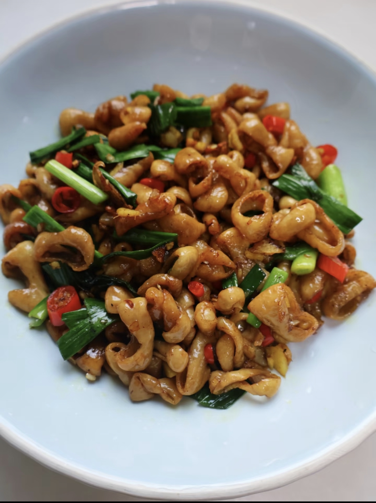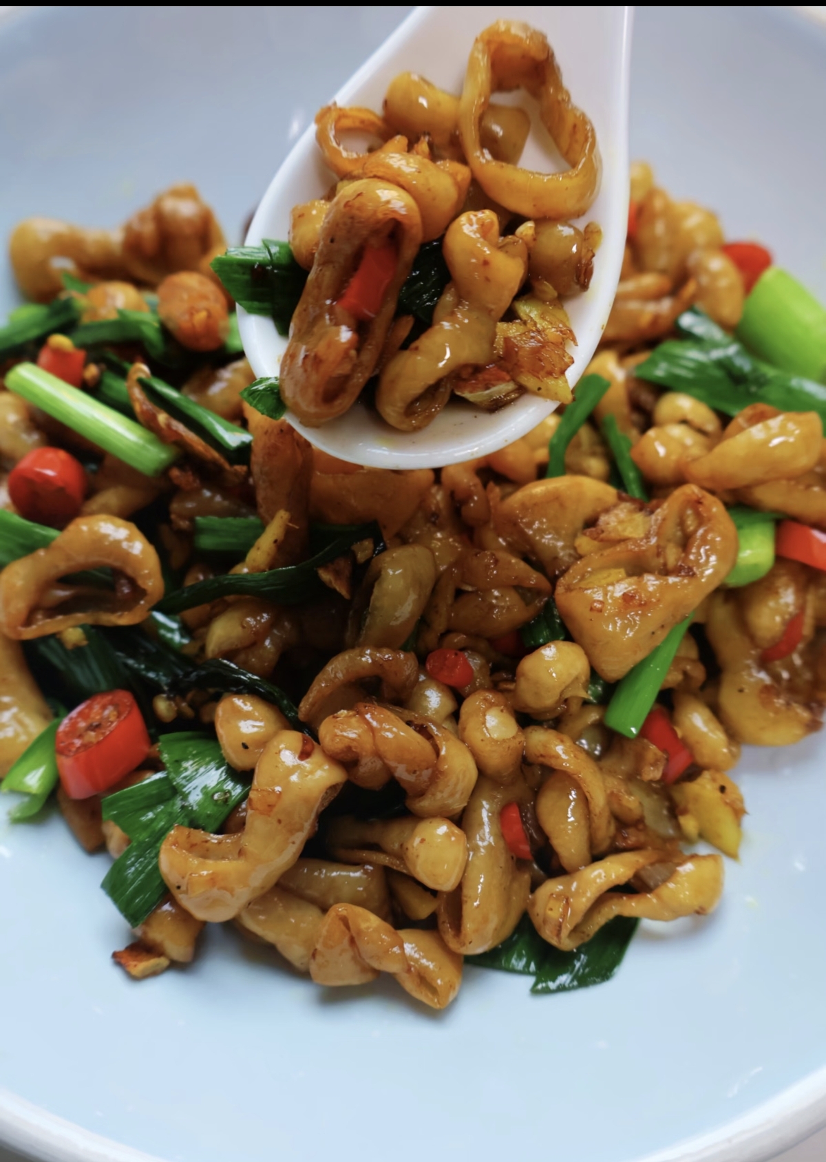 爆炒的关键是“大火快攻”。锅烧热,倒比平时炒菜多一点的油,油温七成热时,先下干辣椒、花椒、姜蒜末,“刺啦”一声,香味瞬间炸开。接着倒入肥肠,转最大火快速翻炒,听着锅里“滋啦”作响,看着肥肠表面慢慢变得焦黄,边缘微微卷起,出现诱人的“虎皮”状——这一步要把肥肠的油脂煸出来,才会外焦里嫩不油腻。