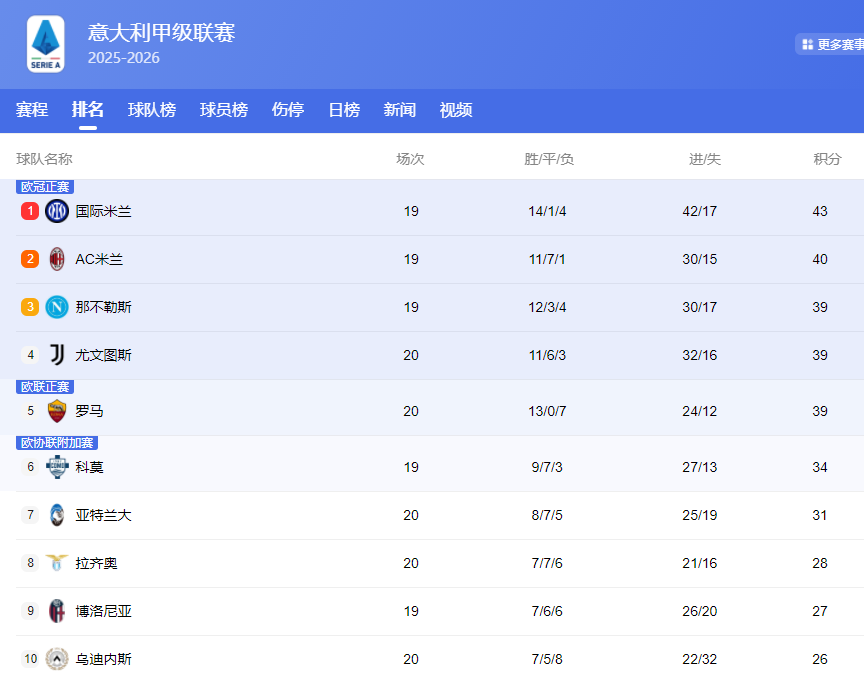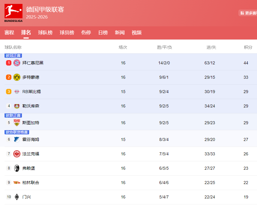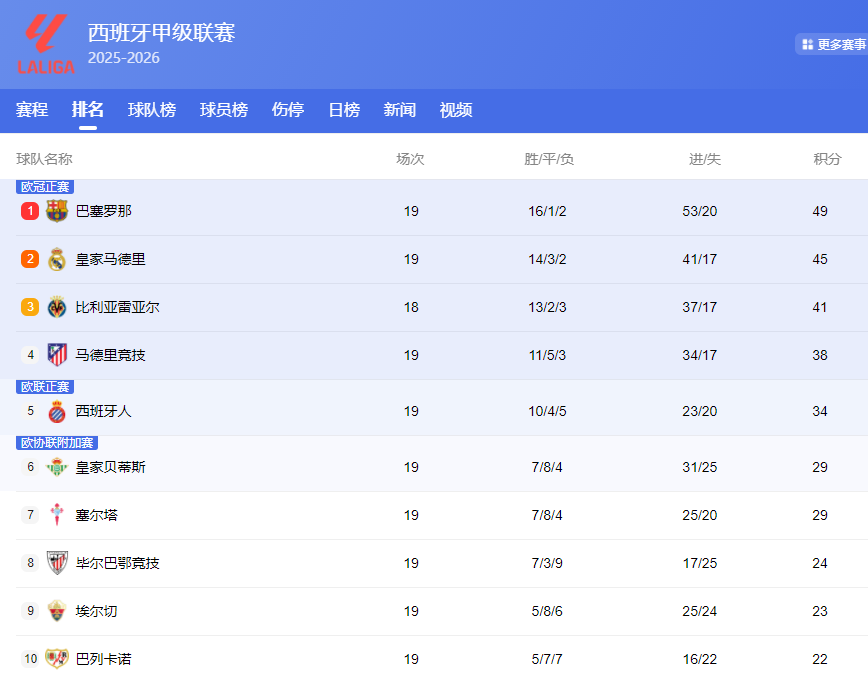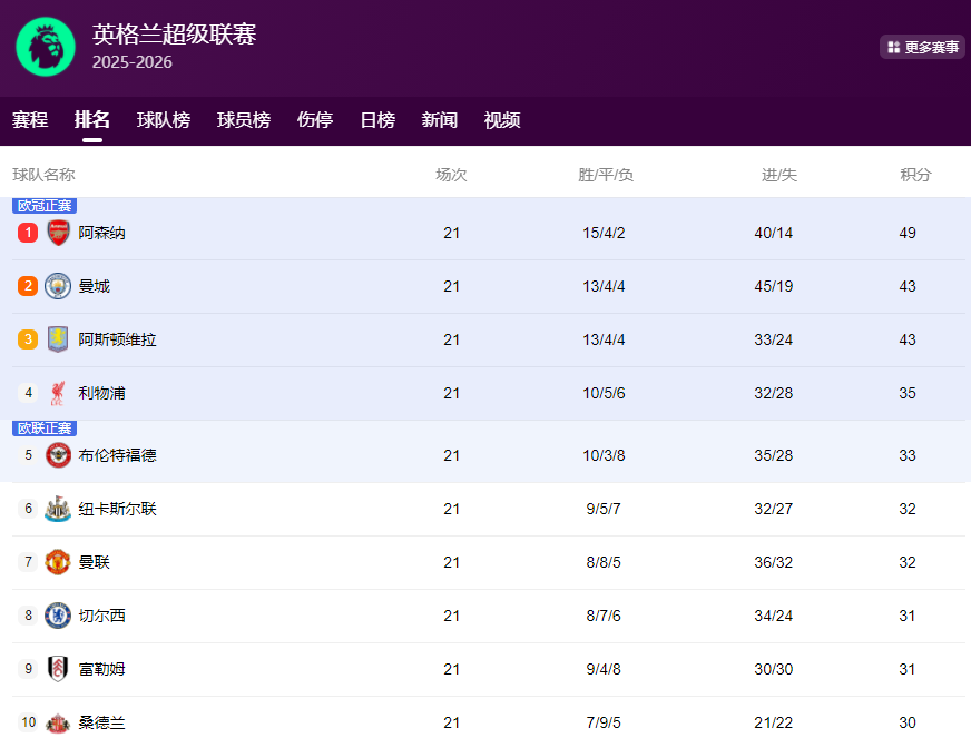 北京时间1月13日,足球五大联赛最新积分榜更新: