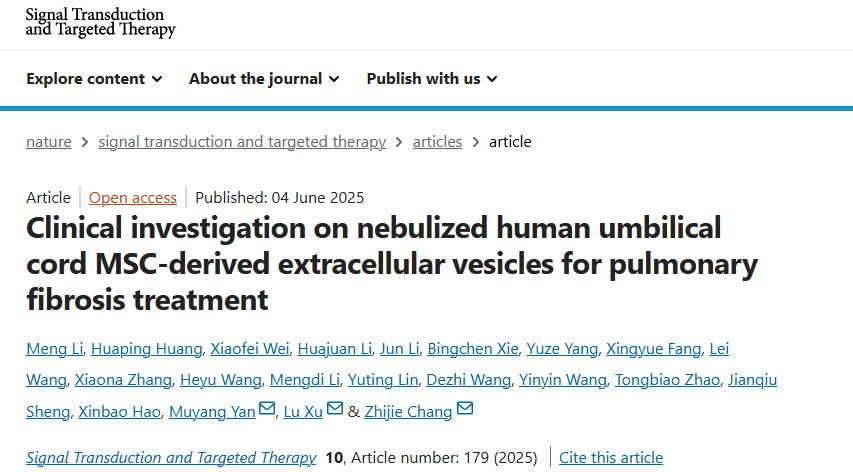 目前,外泌体雾化吸入疗法在呼吸系统疾病中已展现出广阔前景,尤其在肺纤维化这一难以治愈的疾病中取得突破。肺纤维化如同肺部组织逐渐“石化”,传统治疗手段有限。近期发表于《Signal Transduction and Targeted Therapy》的一项临床研究报道,患者通过雾化吸入脐带来源的特定外泌体,成功实现了肺纤维化进程的阻遏甚至逆转。
