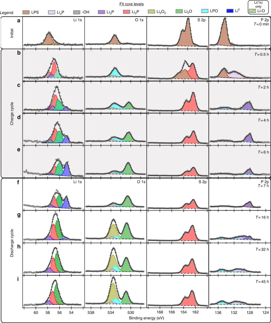 近表面薄层图7随着锂(Li)在材料表面蒸发时间的增加(0h, 6h, 12h),硫(S 2p)和磷(P 2p, P 2s)元素的结合能谱图变化。DOI:10.1038/s41467-025-64357-3