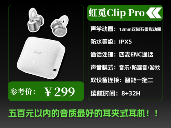 在五百元内我用过的耳夹式耳机里,虹觅 Clip Pro 的综合表现很亮眼,说是五百元内首选的耳机一点不夸张。音质是它的一大优势,13mm 双磁石墨烯单元让声音表现很出色。首先双磁单元是通过两款高精度叠加的磁铁,加强磁场,进一步提高音质、音量,加上石墨烯这种材料的形变能力强,能让声音更清晰,再加上气旋式引擎腔体技术,让声音气流推力更足,重低音浑厚有力,在同价位里根本没有对手,完全就是音质天花板级别的表现。