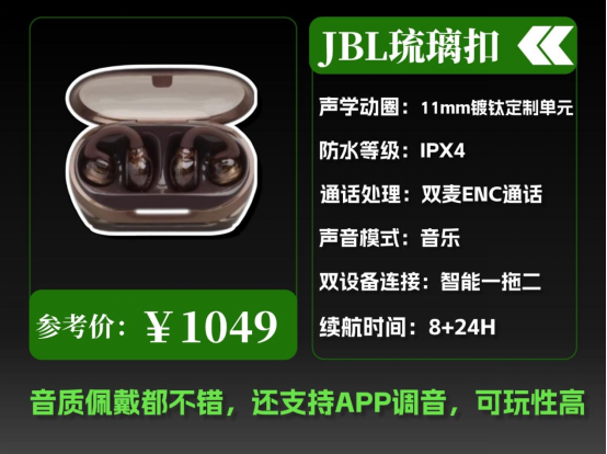 售价:1049元推荐理由:戴久耳朵不酸,音质清楚通透,还能自己调音效,用着很顺手。