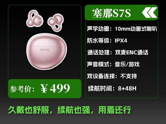 塞那 S7S 各方面的表现我都挺满意的,这款耳机单只仅 4.2g,是目前我测过的所有耳机里面最轻的一款。耳机的空气耳骨结构设计得比较合理,稳定性不错的同时舒适度也很好。