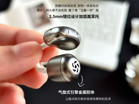 它的佩戴设计很贴心,耳夹采用前高后低的2.5mm 错位结构,卡在耳廓上特别稳,平时走路、弯腰捡东西都不会晃。而且12°弧面耳托贴合耳背,支撑力足够却不压耳朵,就算连续戴两三个小时,耳朵也不会有不适感。