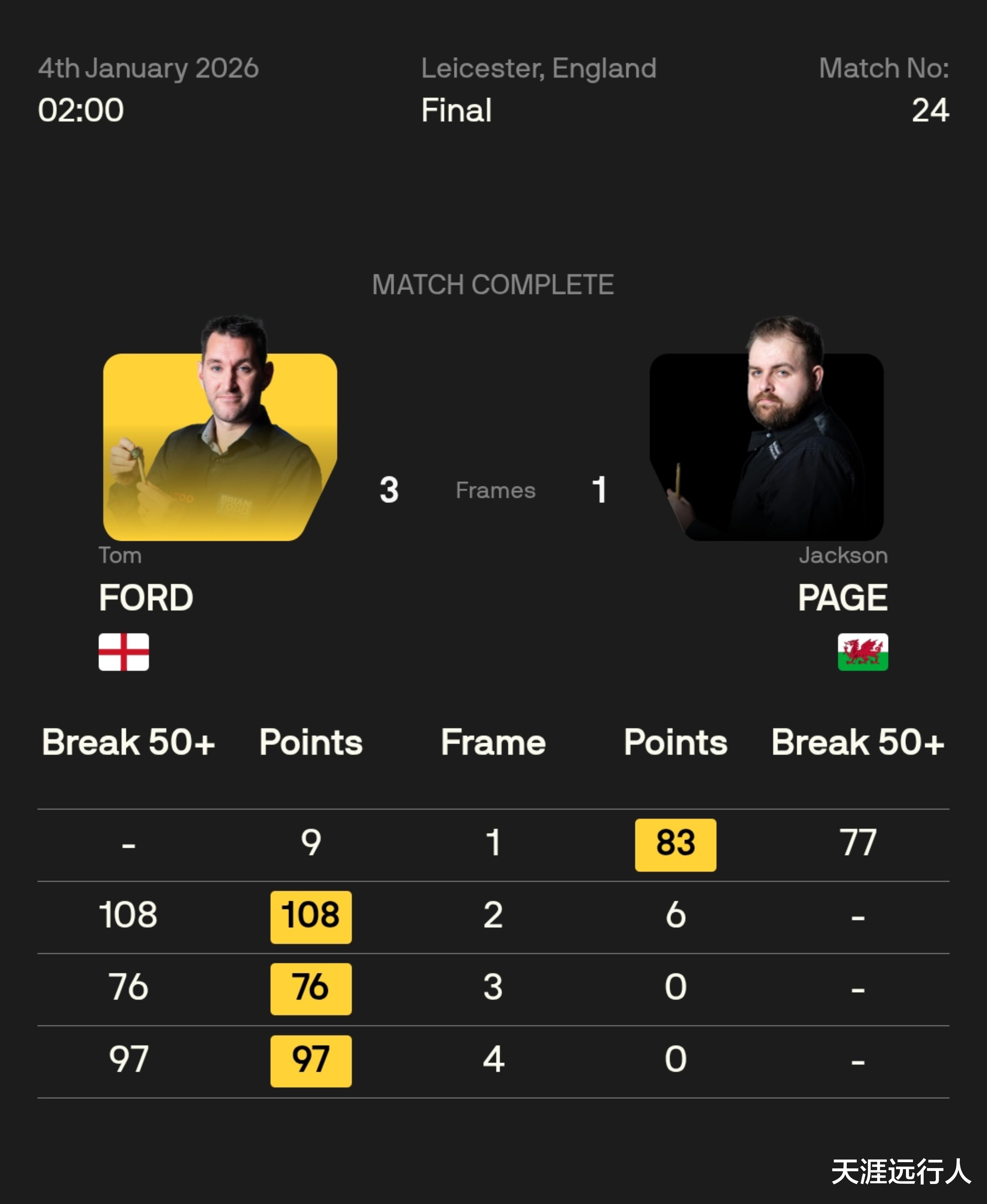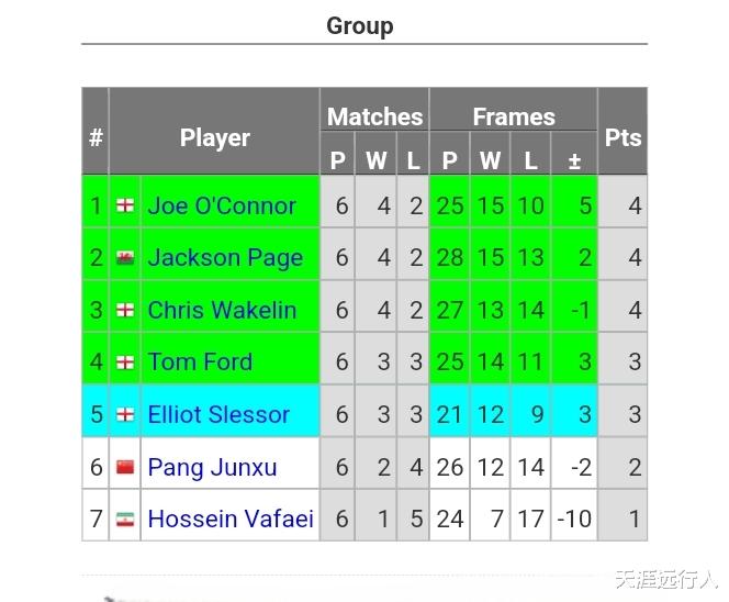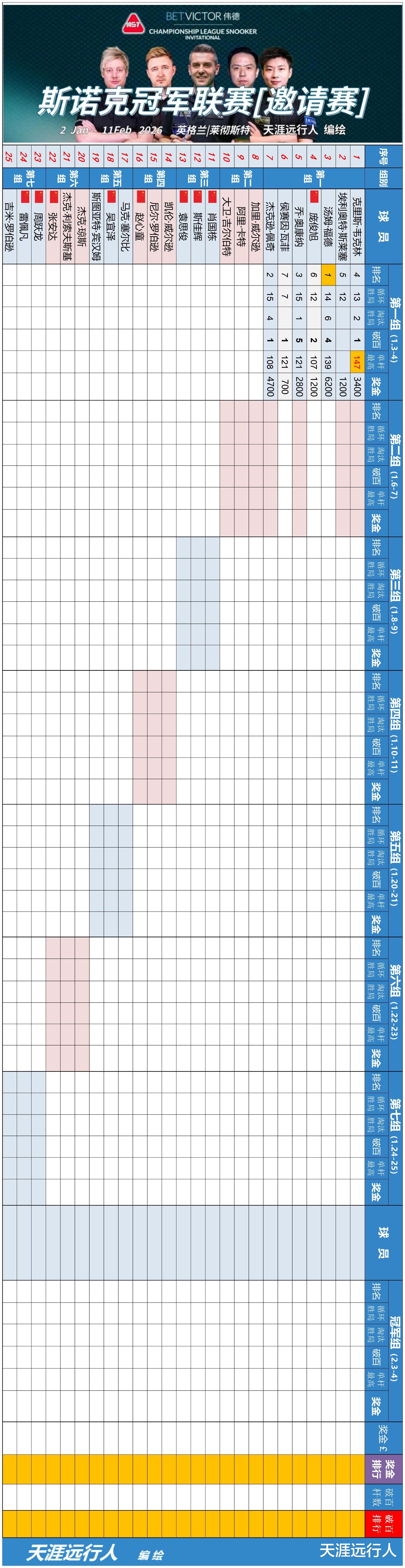 第一组七位球员中,两位零零后,四位九零后,年龄最大的老油条、唯一的一位八零后汤姆·福德,小组争冠附加赛决赛以3-1力压威尔士零零后小将、2025世锦赛资格赛阶段一场轰出两杆单杆147的杰克逊·佩奇,夺得小组冠军,率先杀进胜者组,静待其余六个小组的胜者,争夺最终的总冠军。