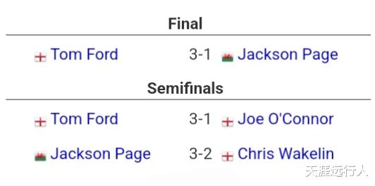 小组循环赛战罢,乔·奥康纳、杰克逊·佩奇、克里斯·韦克林的战绩都是四胜两负,分列前三,汤姆·福德三胜三负,位列第四,四人晋级争冠附加赛。