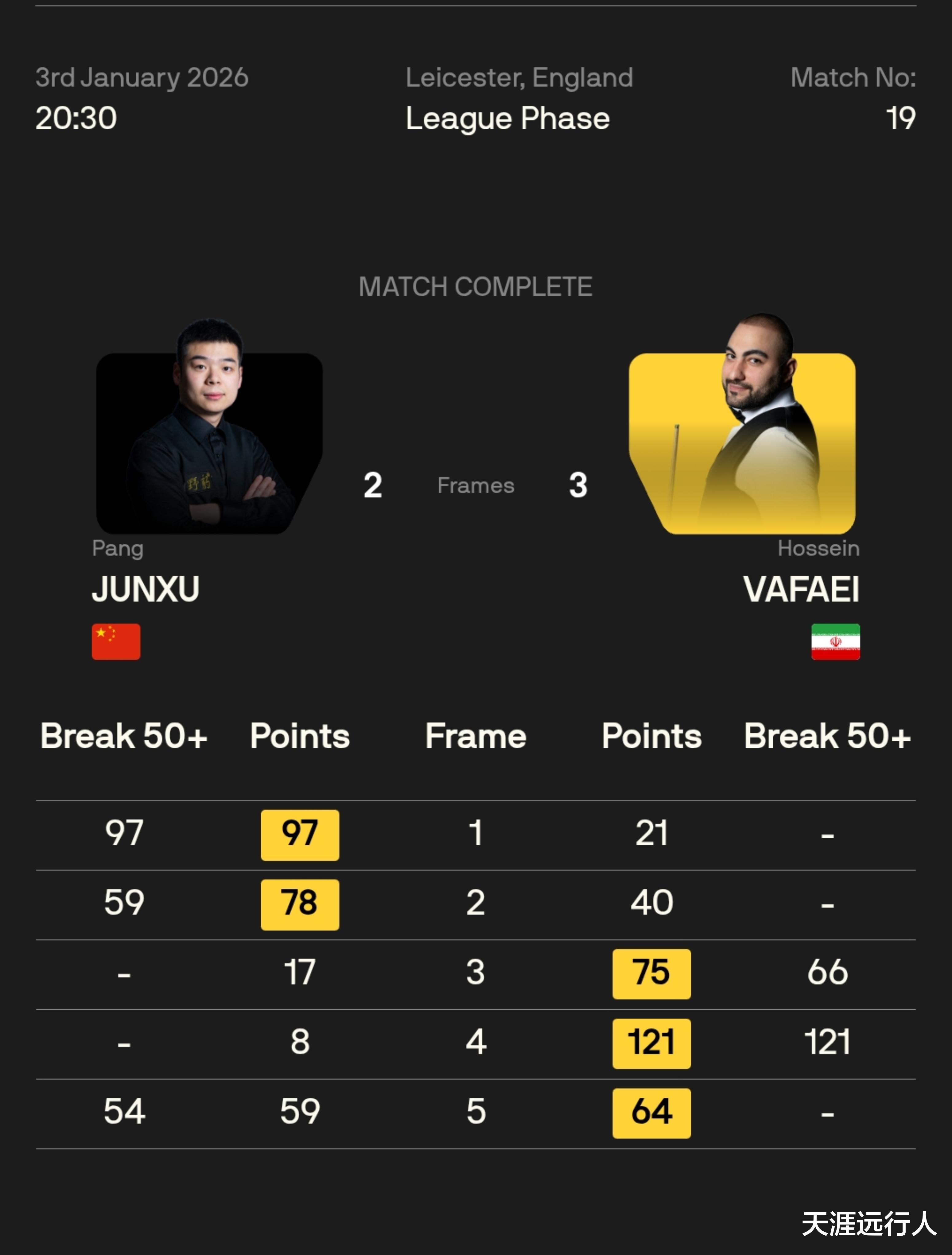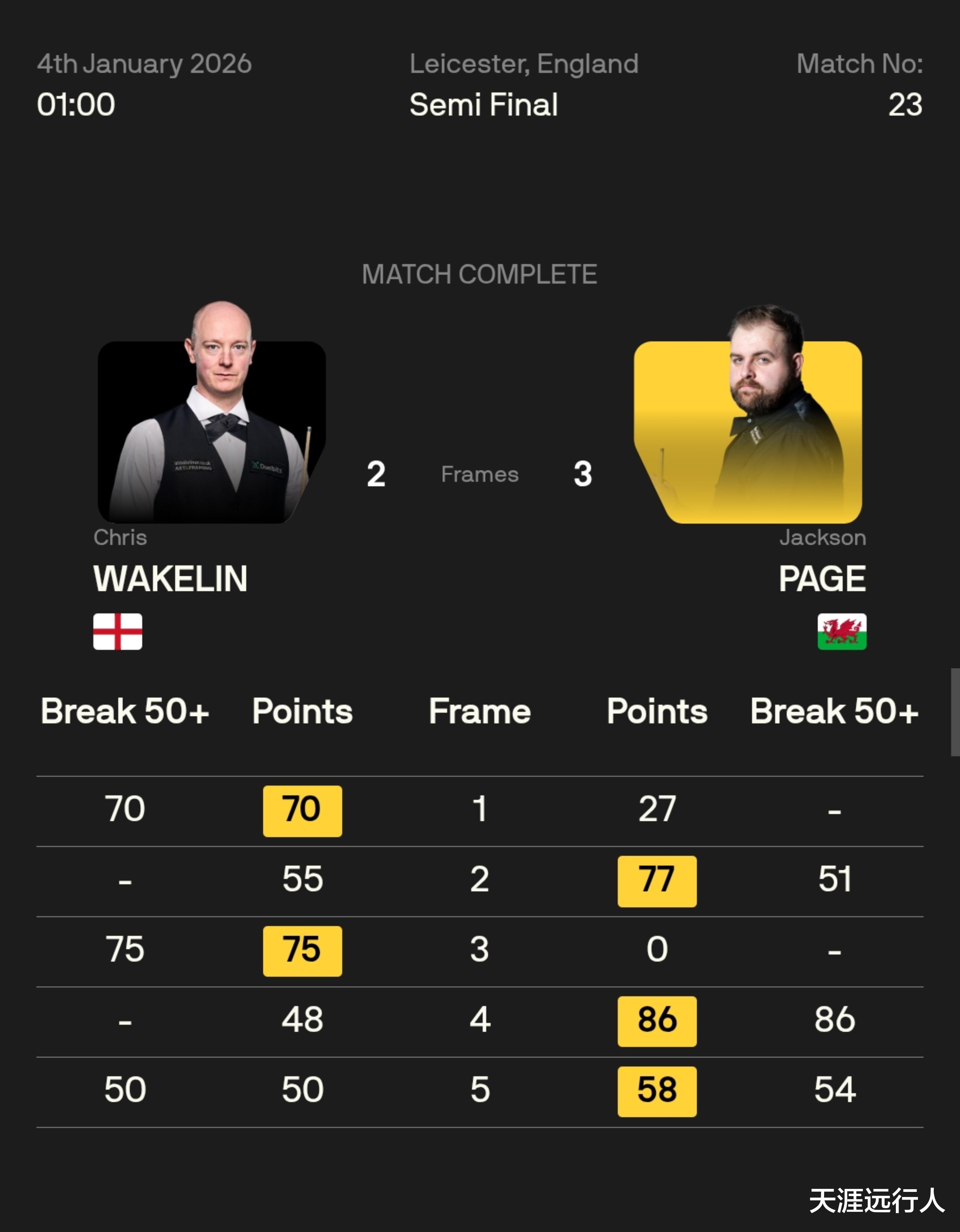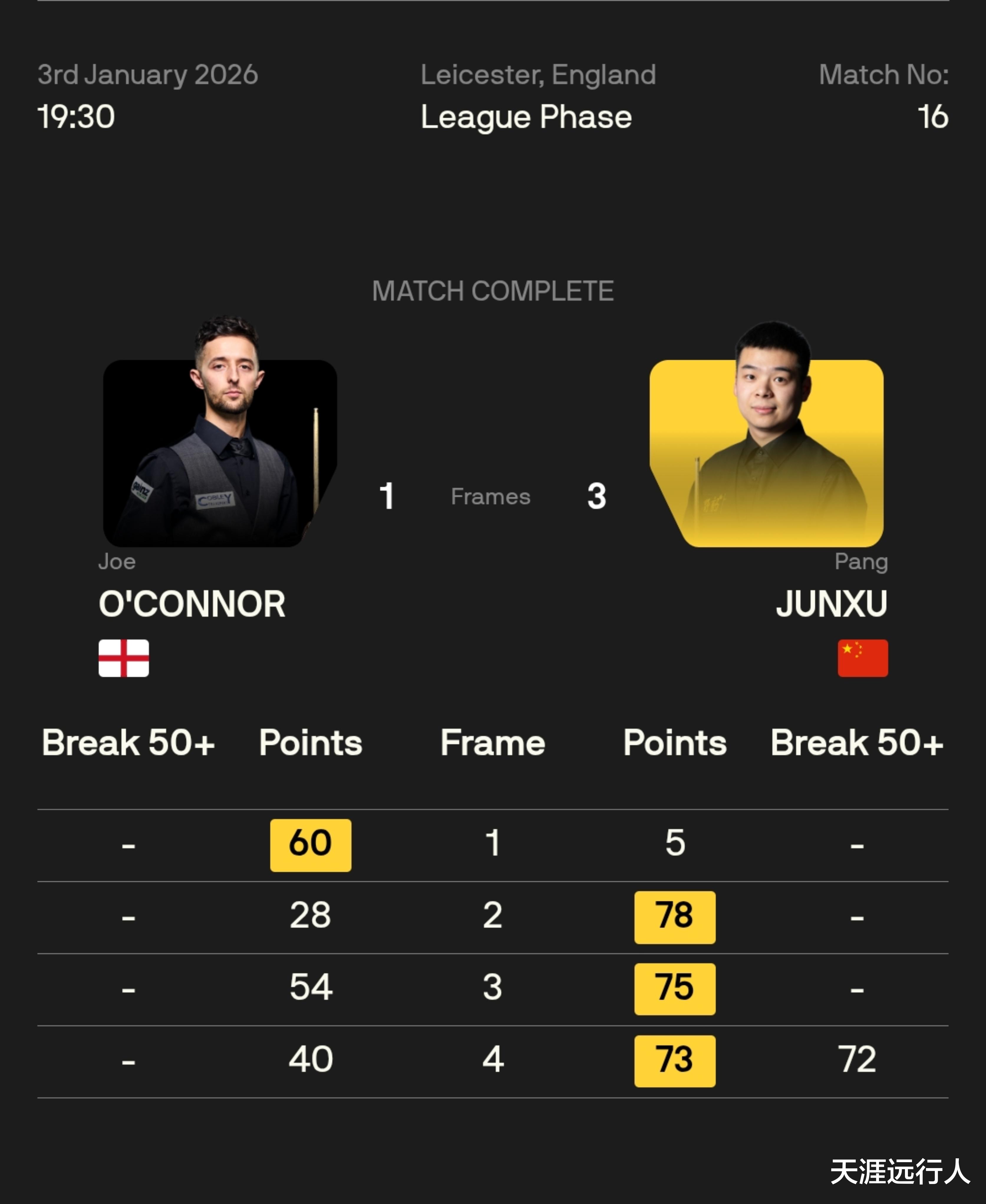 北京时间1月4日凌晨3时56分,BetVictor 2026斯诺克冠军联赛邀请赛版,第一小组第二比赛日的比赛,在莱彻斯特马蒂奥利竞技中心全部决出了胜负。