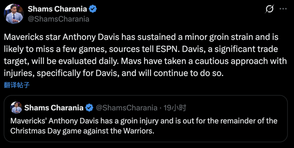 据悉浓眉是独行侠的重要交易目标,球队将每天对其进行评估。独行侠在处理伤病问题上一直采取谨慎的态度,尤其是对浓眉的伤情,并将继续如此。