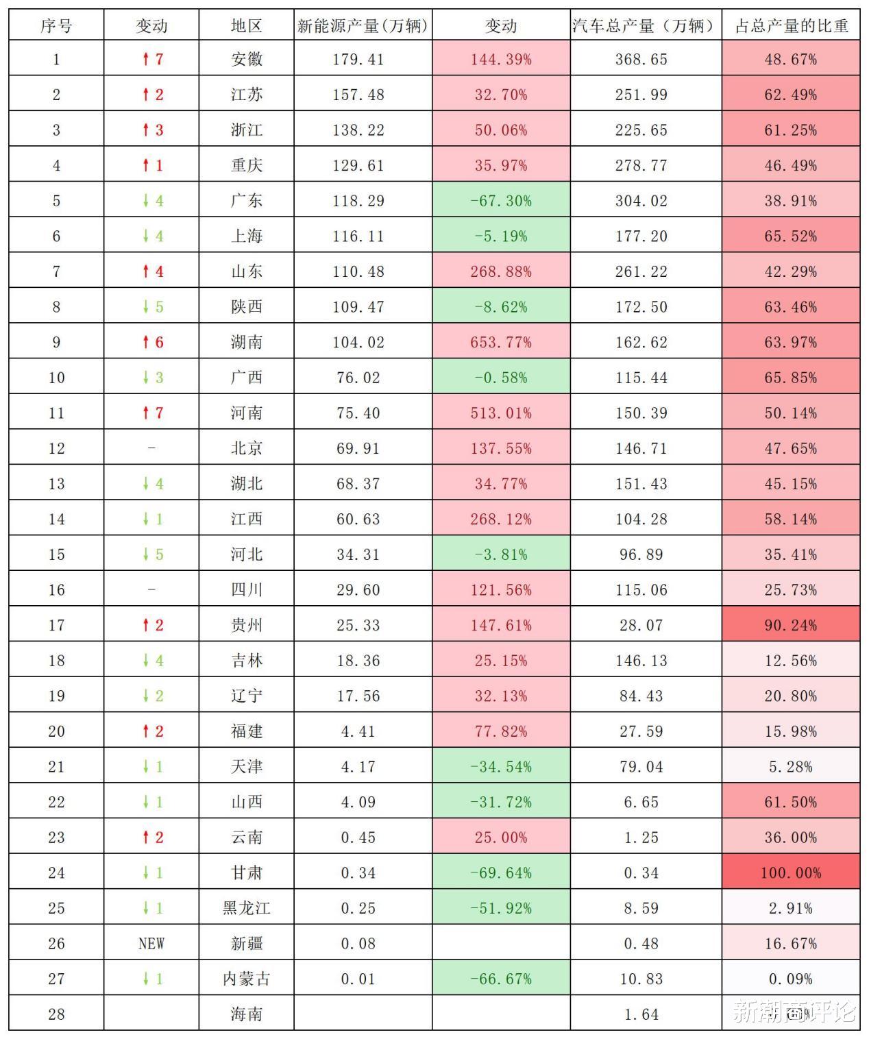 去年,安徽省汽车产量368.65万辆,同样位居全国第一,新能源汽车产量占比48.7%。这一比例处于中游水平,有11个省份新能源占比>50%,江苏、浙江、上海、陕西、湖南等占比全部过半,直接带动增速高于全国平均20-40个百分点。