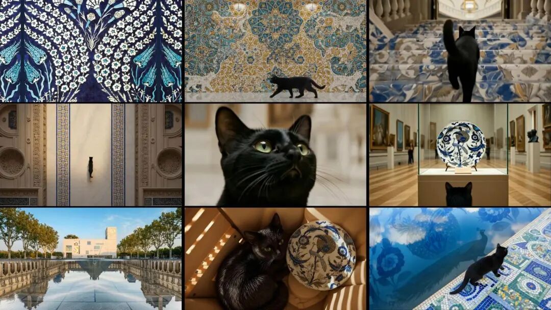 我们尝试过很多版本:魔法阵一样的花纹,镜头摇下去进入一个伊斯兰艺术世界,花纹从画面里凸起等。后来我们意识到“有意思”还不够,还需要情绪增量,于是用一个对比设计:开头用压抑的极端俯视,镜头运动到尾帧时进入一个巨大的开阔空间,让观众产生豁然开朗的感受。最终镜头里两侧的图案像传送带一样动,把猫带入一个开阔的展品空间。